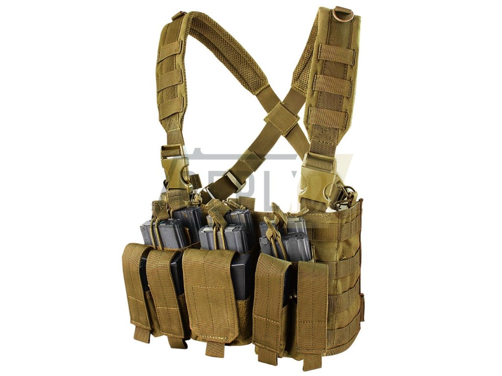 Taktická vesta Recon Chest Rig od amerického výrobce firmy Condor Outdoor, profesionální vesta s napevno vestavěnými pouzdry pro zásobníky. Tři dvojité sumky pro zásobníky typu M4 a čtyři a jedna dvojitá sumka pro zásobníky pistolové. Na bocích vesty zůstává prostor s PALS vazbou pro individuální nastrojení MOLLE výstroje. V předním panelu za sumkami je integrovaná admin kapsa se zapínáním na suchý zip, například pro mapu, nebo dokumenty. Vesta má polstrované, křížové Cross-back ramenní popruhy s otočnými Swivi Lockster fastex zadními sponami. V horní části jsou popruhy osazeny D-kroužky. Vesta má oboustraně stavitelný bederní popruh.
