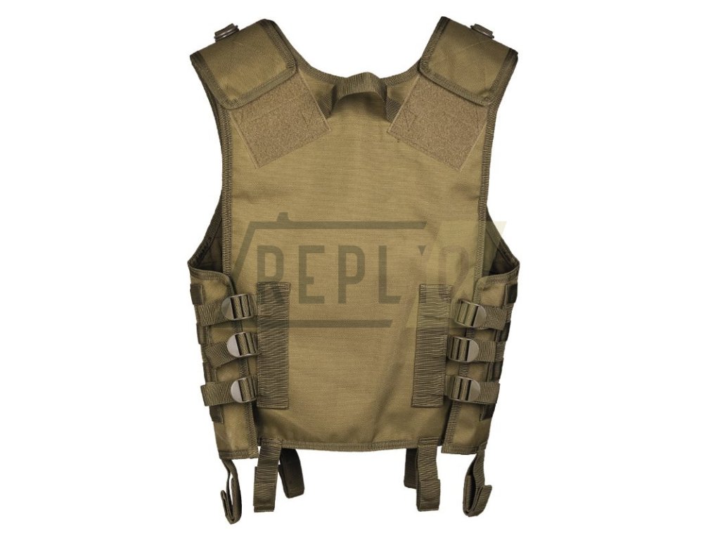 Pohodlná taktická vesta vyrobená z odolného polyesteru. Zapíná se pomocí pevného středového zipu, který je doplněný o trojici plastových FASTEX přezek. Vesta jde jednoduše nastavit na bocích pomocí přezek a v ramenou pomocí suchého zipu. Přední část vesty je pokrytá MOLLE/PALS vazbou, která vám umožní připevnit kompatibilní doplňkové vybavení. V zadní části naleznete záchranné madlo. K připojení opasku naleznete ve spodní části celkem šest smyček.
