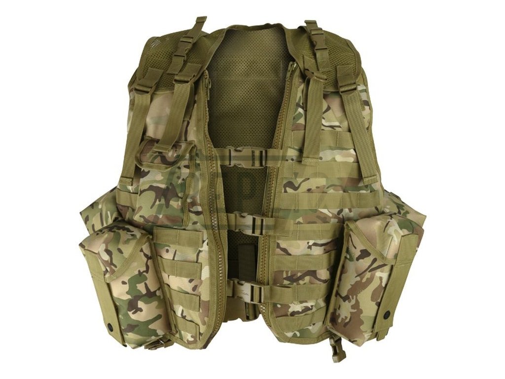V přední i zadní části je vesta opatřena modulární vazbou standardu MOLLE/PALS, která umožňuje připevnění dodatečného kompatibilního vybavení. Na vestě naleznete celkem pět pouzder. Přední spodní pouzdra jsou uzavíraná pomocí chlopně se suchým zipem a drukem, přičemž levé pouzdro je možné z modulární vazby vyvázat a nepoužívat. Horní pouzdro/kapsa je menší a vhodná na uložení kompasu si podobně rozměrného vybavení. Zadní pouzdra jsou šitá na pevno a jsou jištěna chlopní s plastovou přezkou. Levá i pravá část vesty lze rozepnout zipem a ve vniklém prostoru naleznete dvojici přihrádek vhodných na drobnější vybavení či cennosti. Vesta se v přední části spíná pomocí trojice plastových fastex přezek.
