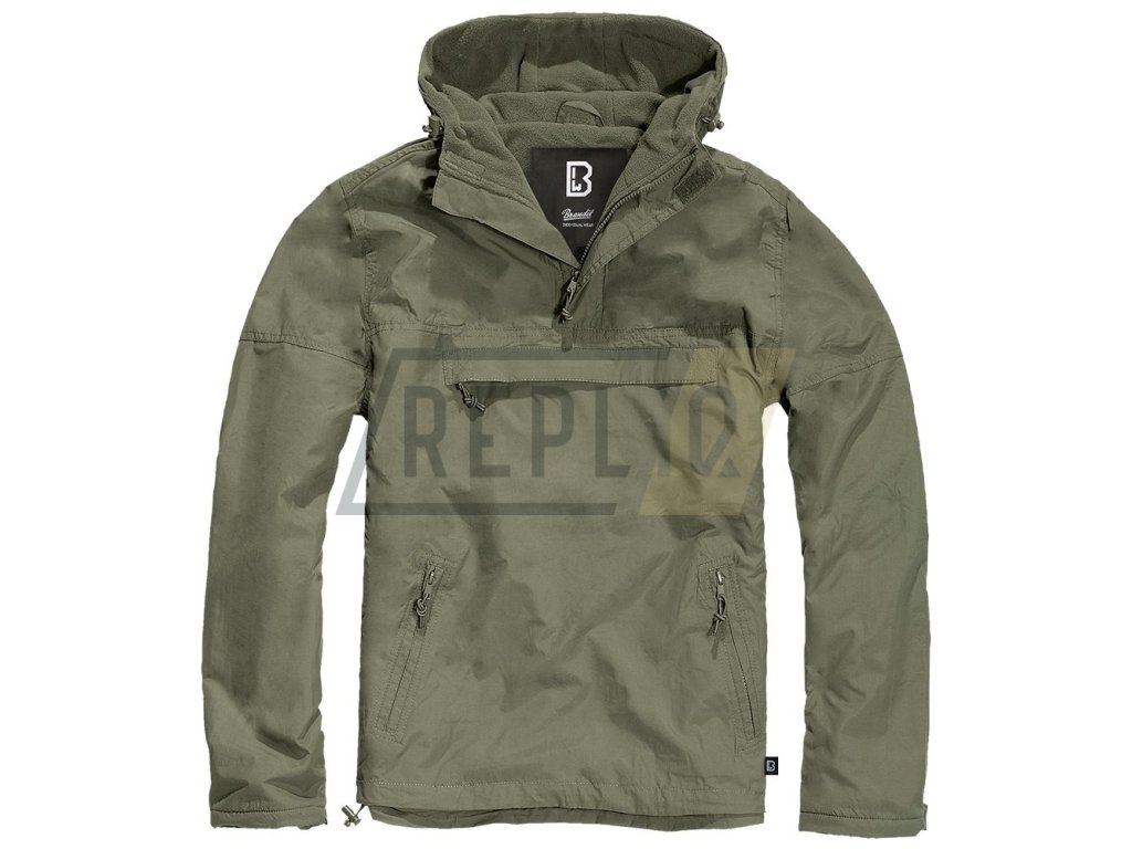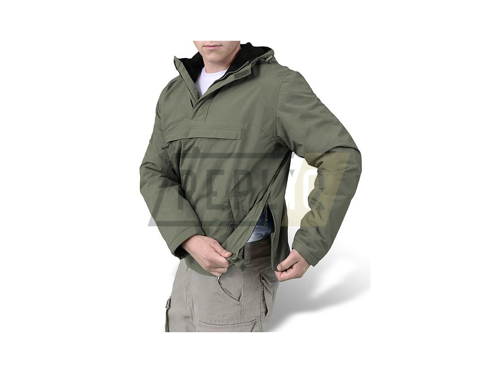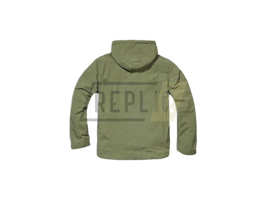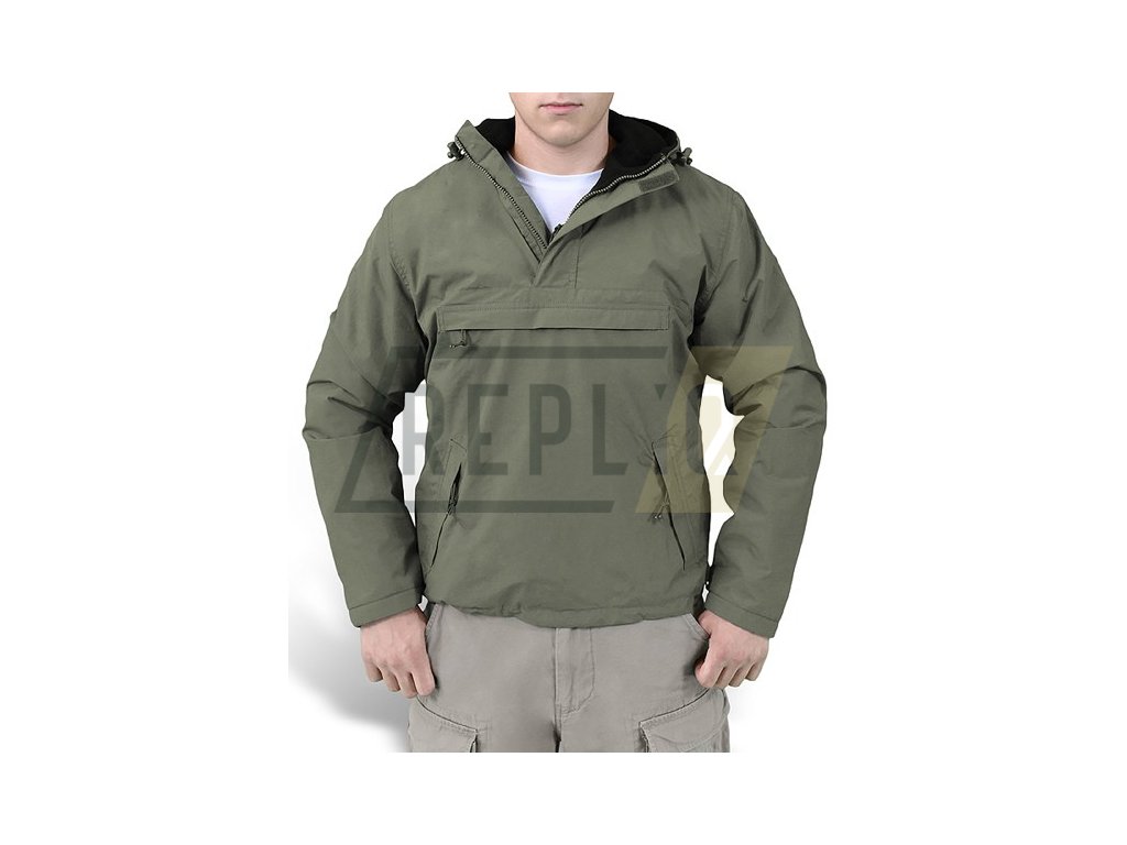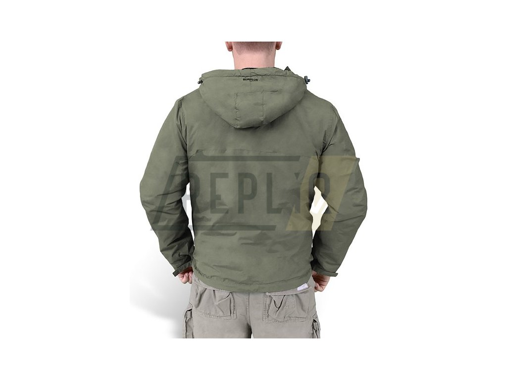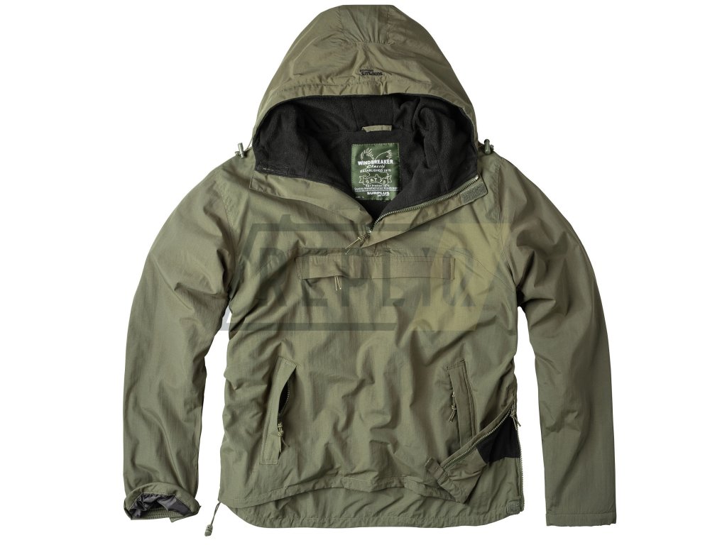 Lehká, prodyšná a díky nylonovému povrchu i nepromokavá větrovka Surplus Windbreaker. Je vybavena pouze krátkým zipem a navléká se přetažením přes hlavu. Toto řešení ještě více zvyšuje odolnost proti větru. Všechny kapsy (jedna velká na hrudi a dvě boční) jsou vybaveny zapínáním na zip a jsou zakryty légami. Zvýšená přední část límce dobře chrání krk, kapuce je stahovací na šňůrku. Šířku pasu lze upravit pružnou tkaničkou, šířku manžet rukávů pomocí suchého zipu. Na levé straně bundy se nachází zapínatelný rozparek, který umožňuje snazší přístup ke kapse u kalhot.
