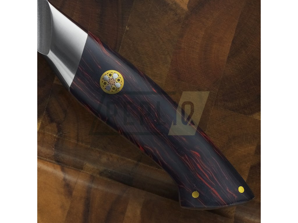 Rukojeť je vyrobena z červené a černé G10 damaškového vzoru. Je zdobená středovým mozaikovým nýtem. Trojité nýtování zajišťuje dokonalou pevnost, stabilitu a spojení ostří a rukojeti. Rukojeť je pečlivě ručně leštěná, ergonomicky tvarovaná a navržená pro vynikající ruční ovládání. Speciálně navržený tvar rukojeti je vhodný pro asijský úchop nože. G10 je voděodolná a zcela bez zápachu, nevyžaduje prakticky žádnou údržbu. Nezačne v průběhu času korodovat, oxidovat, zůstane stejně tvrdá a pevná.