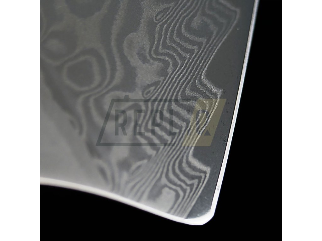 Ostré řezné jádro z vysoce kvalitní oceli 10Cr15CoMoV zajišťuje výborné řezné vlastnosti a dlouhotrvající ostrost při tvrdosti R61 ± 1 Rockwella. Jádro je chráněno 66 vrstvami nerezových damascénských ocelí (Damascus steel), které dodávají noži mimořádnou houževnatost, odolnost proti korozi a nezaměnitelný vzhled. Dokonale vyvážená čepel japonského tvaru s precizně broušeným ostřím minimalizuje tření při řezu, zatímco třpytivý damascénský vzor Ame no Shizuku (雨の雫), připomínající jemné kapky deště na klidné vodní hladině, zabraňuje přilnavosti krájených surovin a stává se symbolem jedinečnosti.
