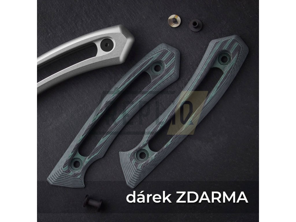 Spojení technického designu, funkčnosti a elegance dělá z této rukojeti nejen praktický, ale i vizuálně výrazný prvek celého nože. A pokud toužíte po změně, můžete design nože jednoduše upravit výměnou za alternativní rukojeť z odolného materiálu G10 – například v kontrastní černo-zelené variantě. Tím získáte nejen jiný vzhled, ale i odlišný hmatový dojem a osobitý styl.