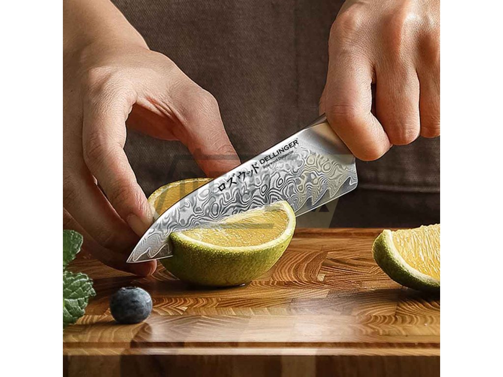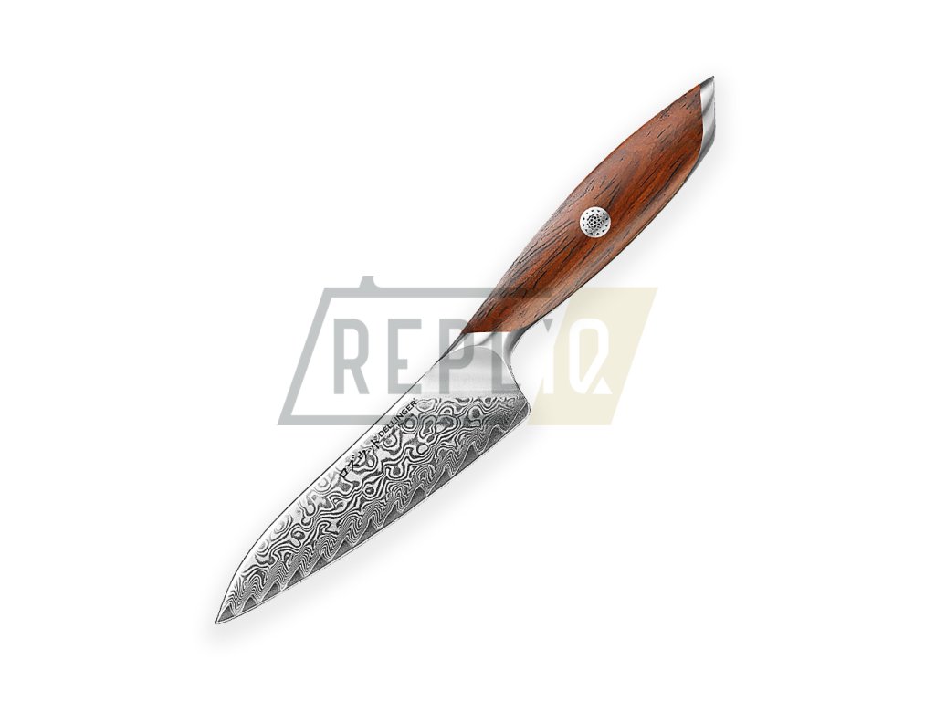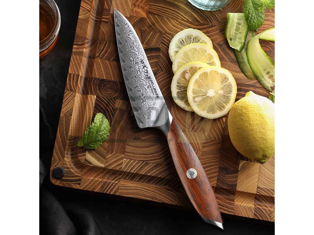 Nová série nožů Dellinger Rose Wood Damascus přináší spojení tradičního japonského designu a moderních materiálů. Tento univerzální nůž, známý jako "Petty Utility Knife" (ペティナイフ, peti-naifu), je ideální volbou pro precizní kuchyňské úkoly. Díky délce čepele 135 mm je perfektní pro krájení menších surovin, filetování, loupání nebo zdobení, a skvěle doplňuje větší nože, jako jsou gyuto nebo santoku.