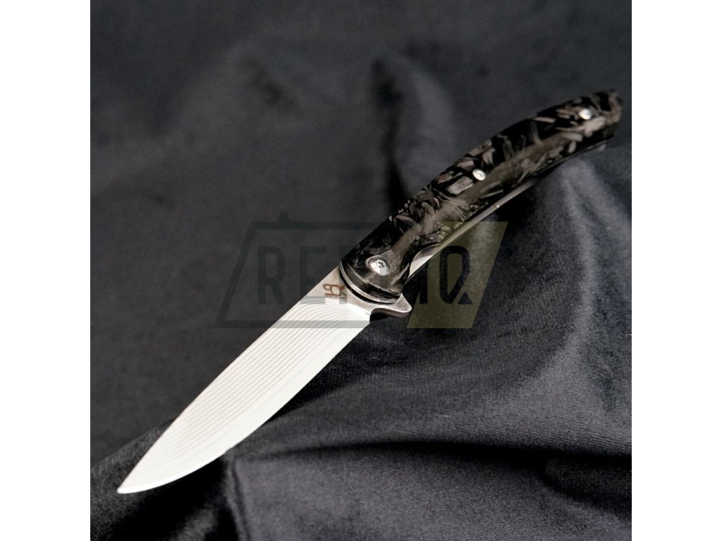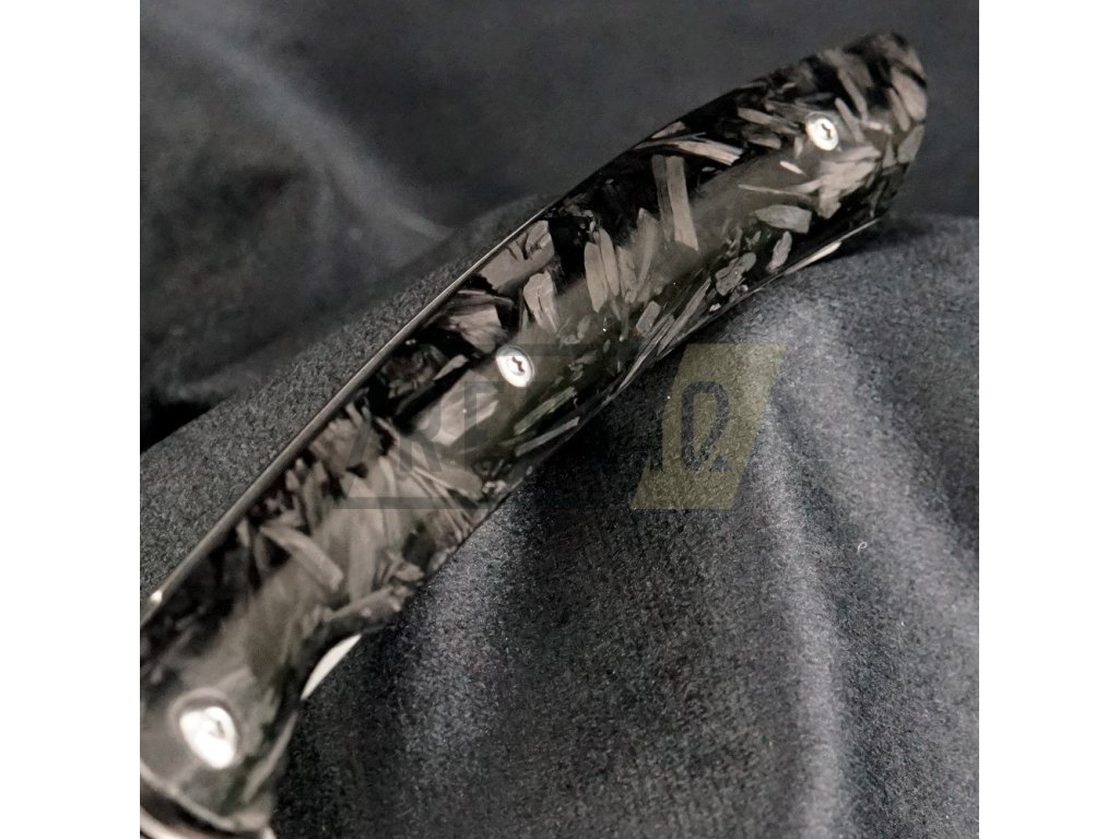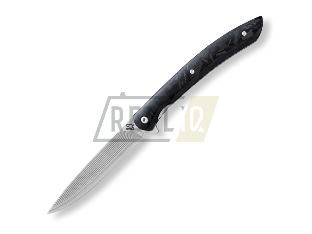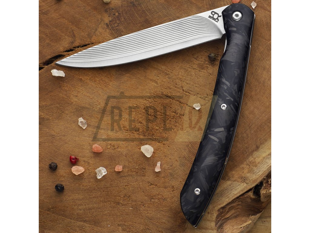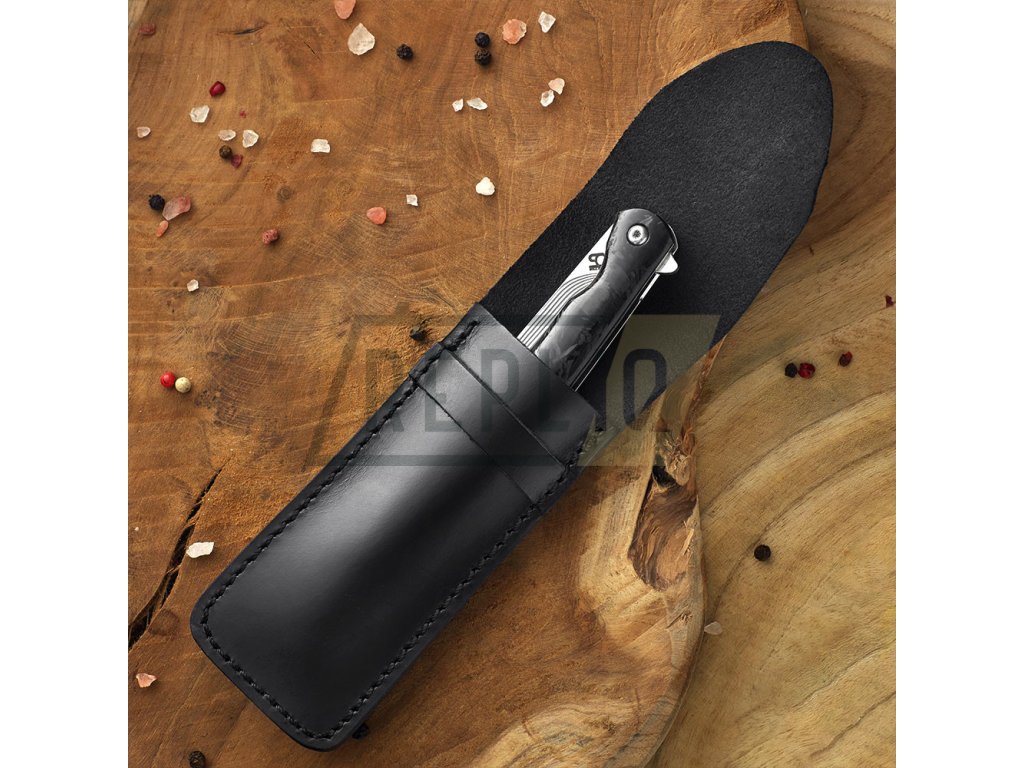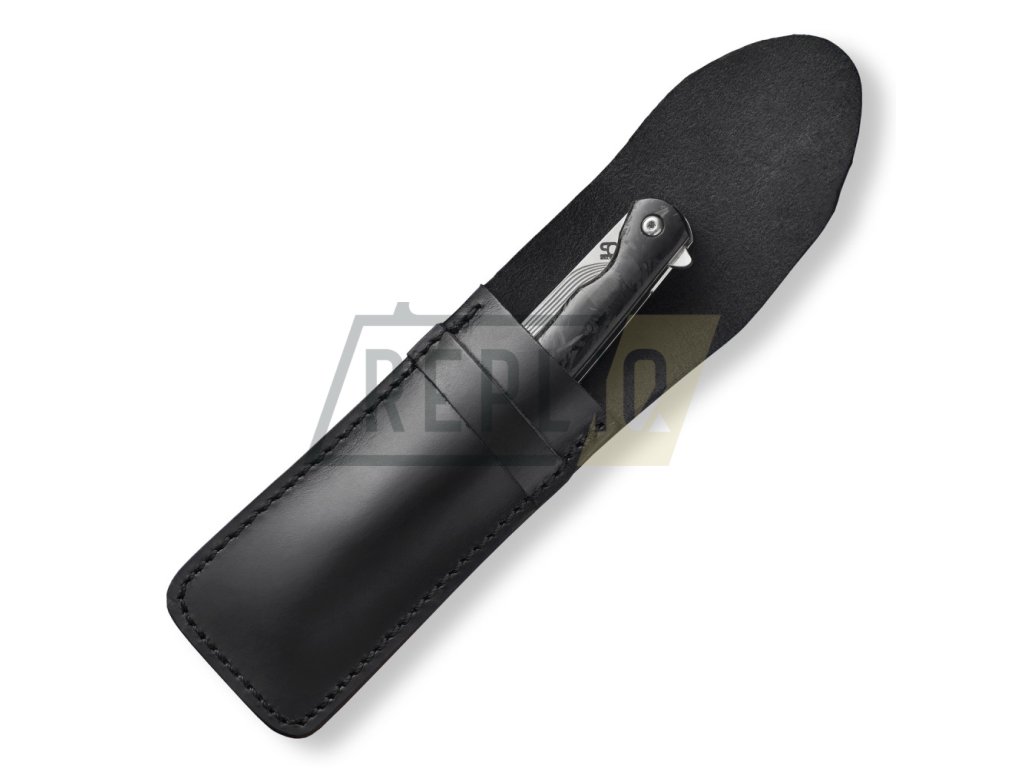 Vše je podtrženo nadčasovou střenkou z karbonových vláken, která je nejen krásná, ale i velmi příjemná pro držení v ruce. Pro snadné skladování se nůž složí do koženého pouzdra.