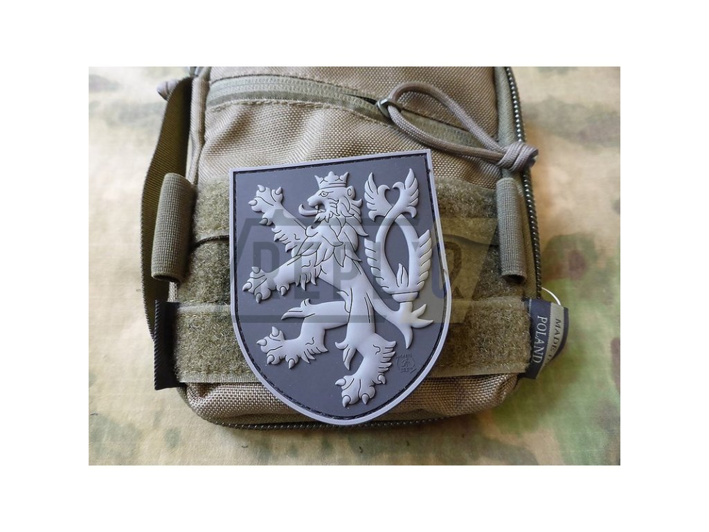 Plastová nášivka ve tvaru štítu/erbu, na které je český dvouocasý lev s korunkou.
