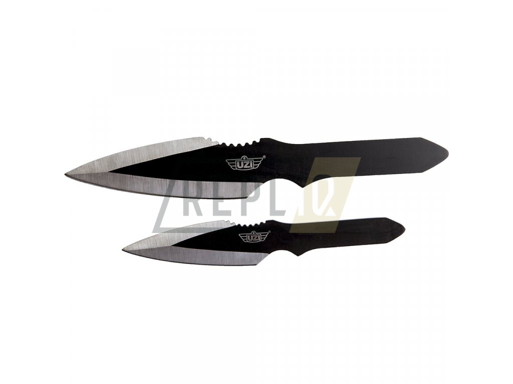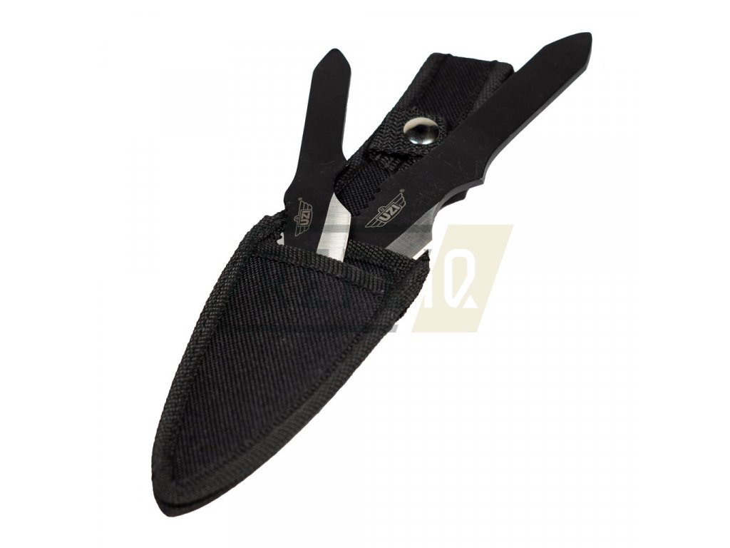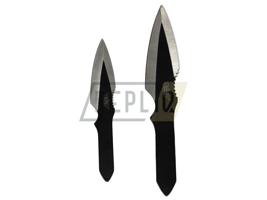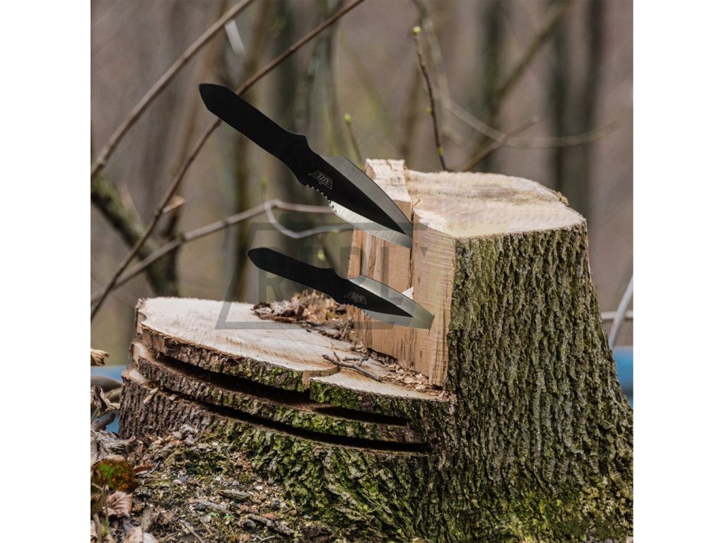 Set dvou různě velikých vrhacích nožů s hladkým ostřím. Nože jsou vyrobené z kvalitní nerezové oceli s částečným černěním. Větší nůž měří na délku cca 20,3 cm při hmotnosti 88g, menší měří cca 15,2 cm při 37 g hmotnosti. K nožům je dodáváno černé nylonové pouzdro.