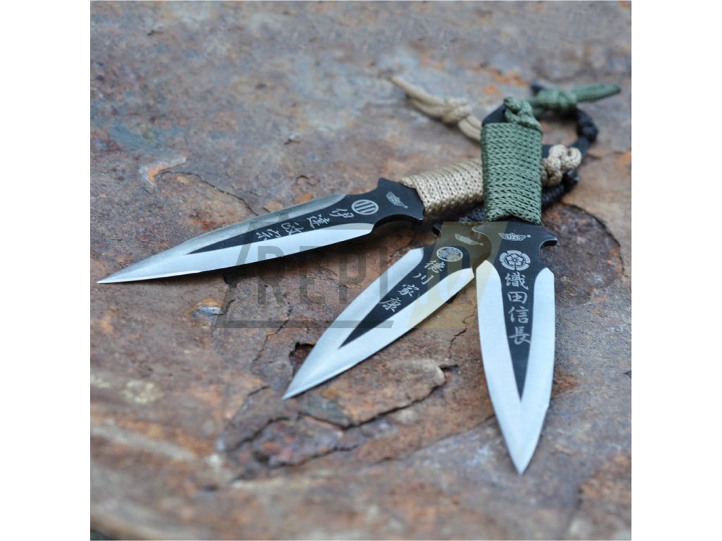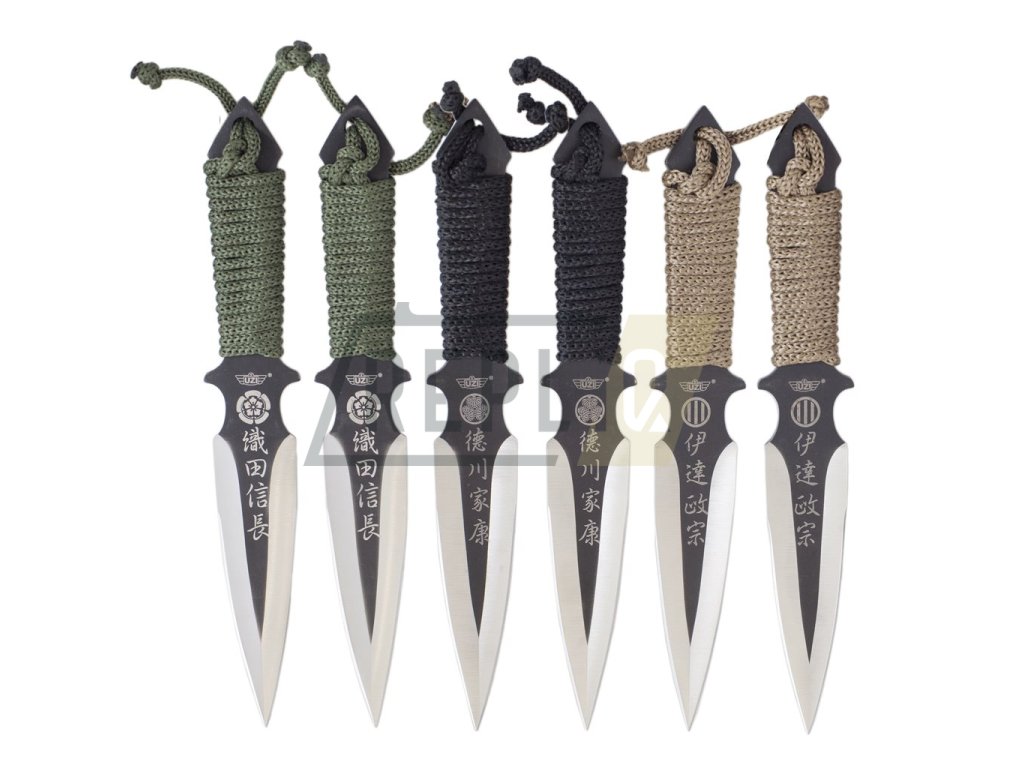 Set šesti vrhacích nožů s hladkým ostřím. Nože jsou vyrobené z nerezové oceli disponují částečným černěním a rytými názvy samurajských klanů na čepeli. Rukojeti nožů jsou omotané zelenou, černou anebo pískovou šňůrou. K nožům je dodáváno polyesterové pouzdro.