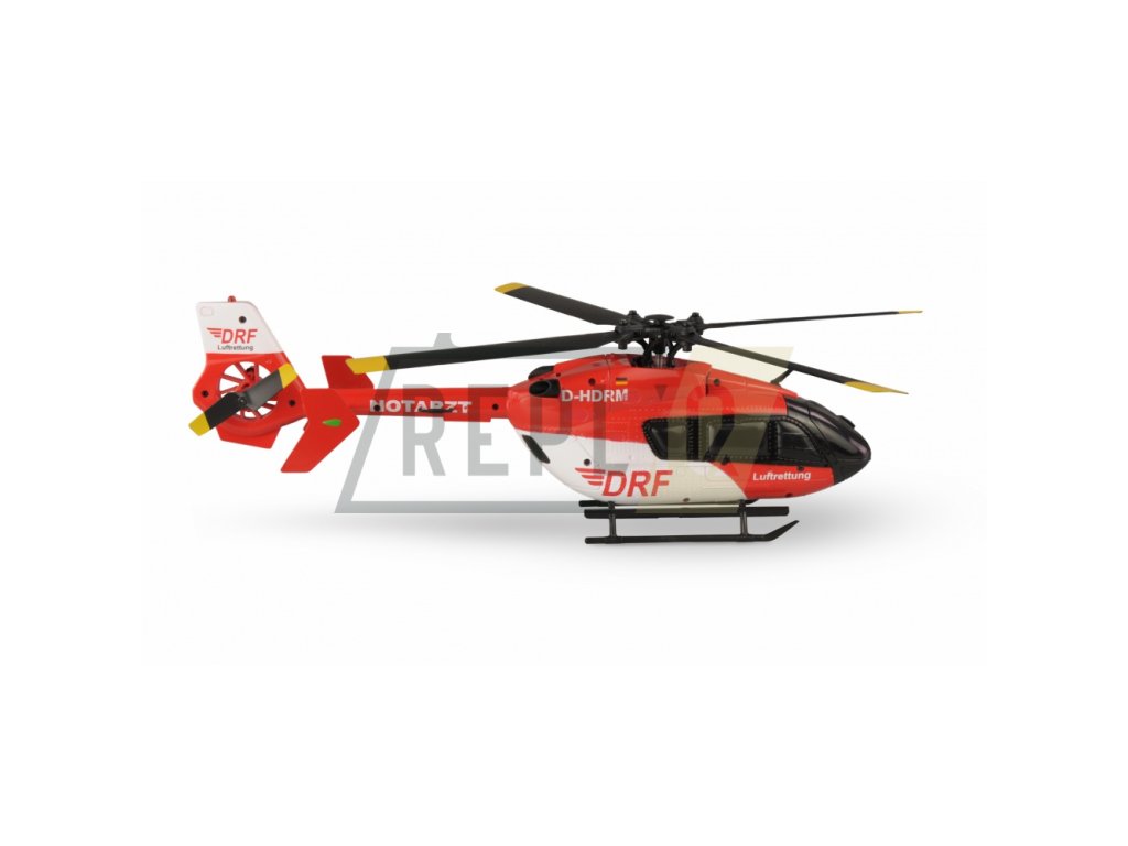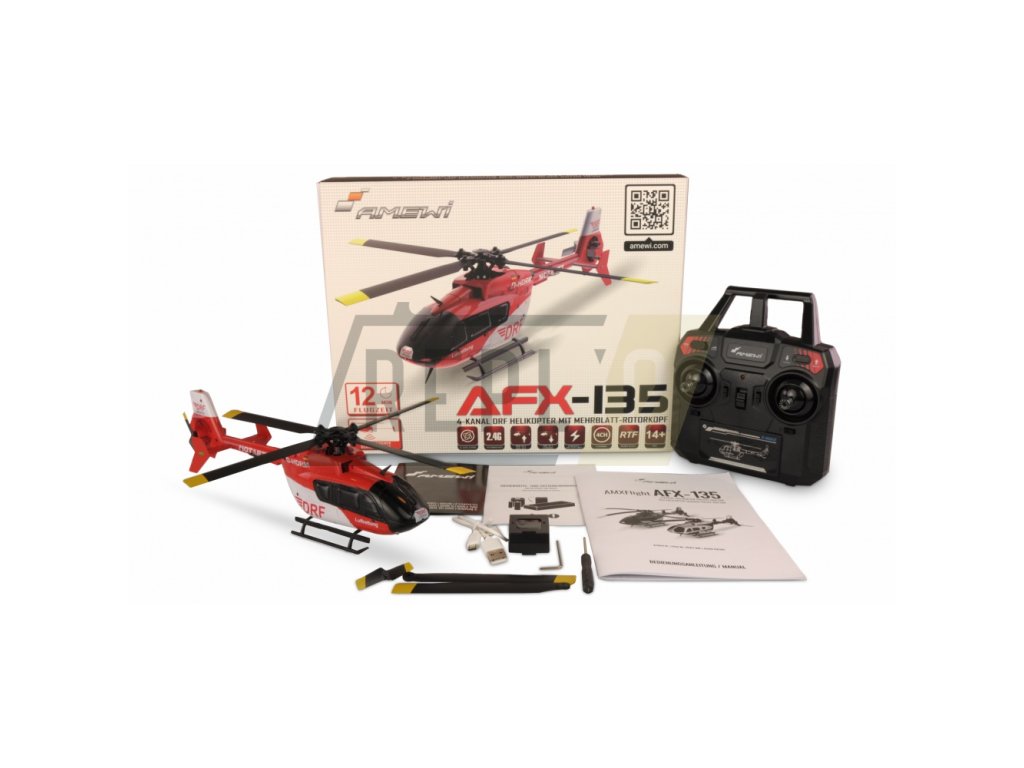 Replika známého vrtulníku s nátěrem v barvách německé letecké záchranné služby DRF - AFX-135 má četné detaily, které zcela odpovídají originálu. I jednotlivé nýty kabiny, která je vyrobena z pevného plastu. Tento zmenšený vrtulník má LED osvětlení vpředu i vzadu, které završuje působivý vzhled. Díky kvalitní elektronice včetně automatického startu a automatického přistání je letové chování příjemné a vrtulník je i přes vícelistou rotorovou hlavu vhodný pro začátečníky. s integrovanou inteligentní baterií je doba letu přibližně 7-9 minut Zvláštností je nabíjecí zásuvka USB, která je zabudována do baterie, kterou jednoduše připojíte k přiloženému USB kabelu. Baterie a model mají funkci sledování napětí (LED začne blikat, když napětí klesne). To znamená, že pilot vždy ví, kdy je lepší zahájit zpáteční let. Vysoce kvalitní 2,4GHz vysílač, který dobře padne do ruky, má tři různé letové fáze (od začátečníka po pokročilé), hliníkové kniply a možnost přepnutí z režimu MODE 2 (při dodání) do režimu MODE 1. AFX-135 DRF je dodáván jako RTF verze (Ready -to-Fly), tedy všechny komponenty - kromě standardních AA baterií do dálkového ovládání - jsou již součástí balení a vrtulník může létat ihned po nabití baterie.