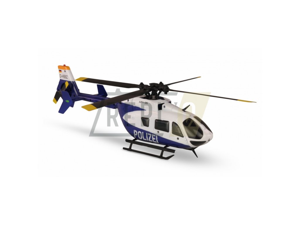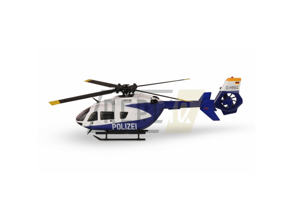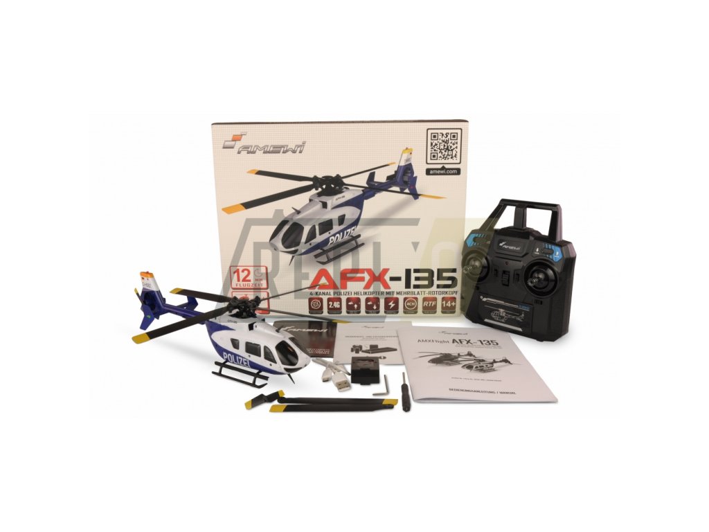 Replika známého vrtulníku s nátěrem v barvách německé policie - AFX-135 má četné detaily, které zcela odpovídají originálu. I jednotlivé nýty kabiny, která je vyrobena z pevného plastu. Tento zmenšený vrtulník má LED osvětlení vpředu i vzadu, které završuje působivý vzhled. Díky kvalitní elektronice včetně automatického startu a automatického přistání je letové chování příjemné a vrtulník je i přes vícelistou rotorovou hlavu vhodný pro začátečníky. s integrovanou inteligentní baterií je doba letu přibližně 7-9 minut Zvláštností je nabíjecí zásuvka USB, která je zabudována do baterie, kterou jednoduše připojíte k přiloženému USB kabelu. Baterie a model mají funkci sledování napětí (LED začne blikat, když napětí klesne). To znamená, že pilot vždy ví, kdy je lepší zahájit zpáteční let. Vysoce kvalitní 2,4GHz vysílač, který dobře padne do ruky, má tři různé letové fáze (od začátečníka po pokročilé), hliníkové kniply a možnost přepnutí z režimu MODE 2 (při dodání) do režimu MODE 1. AFX-135 POLIZEI je dodáván jako RTF verze (Ready -to-Fly), tedy všechny komponenty - kromě standardních AA baterií do dálkového ovládání - jsou již součástí balení a vrtulník může létat ihned po nabití baterie.