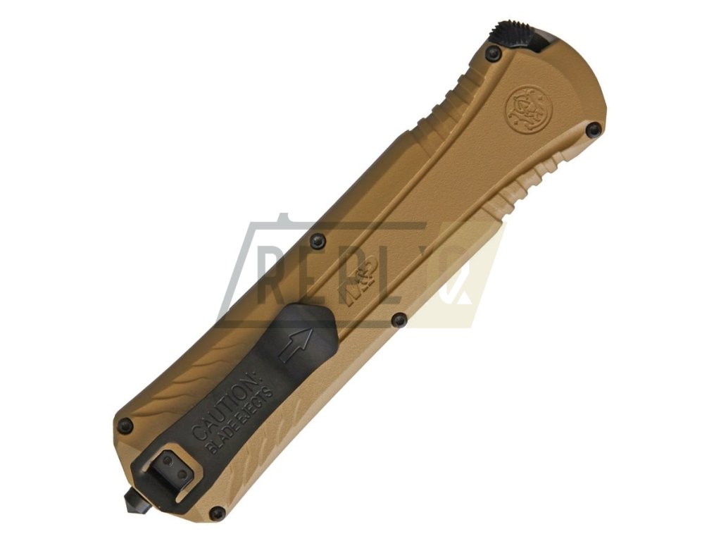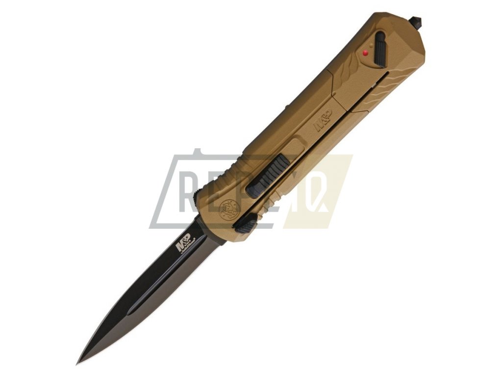 Nůž s čepelí ukrytou v rukojeti. Čepel nože je na jedné straně s hladkým ostřím, s černěným povrchem. Na čepeli označení řady M&P a značky Smith & Wesson.