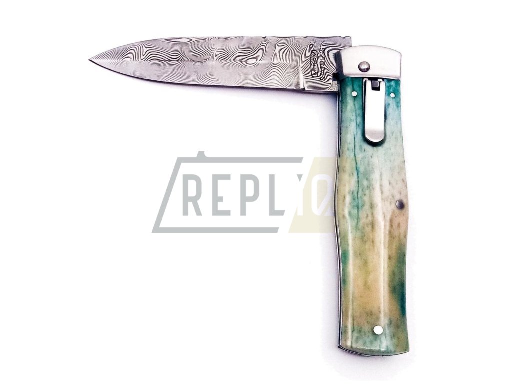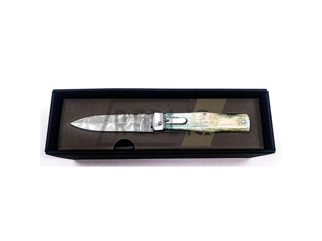 Nůž vyhazovací DAMAŠKOVÁ OCEL střenka z KOSTI + Nůž Mikov Rybička stříbrná 130-NZn-1