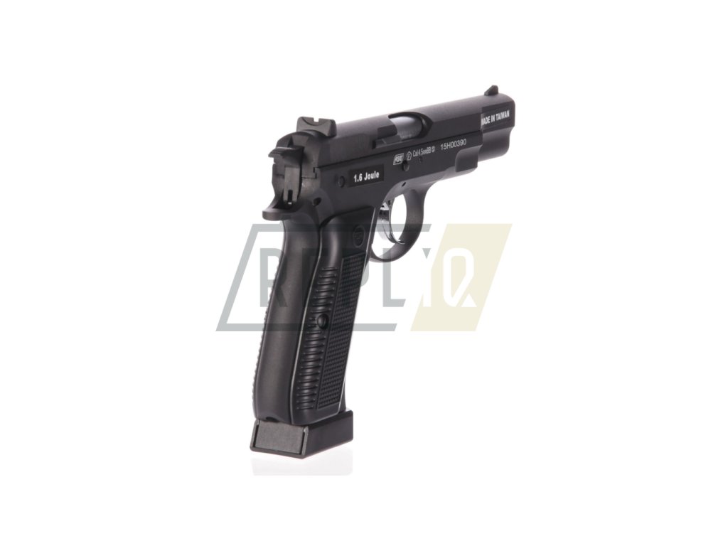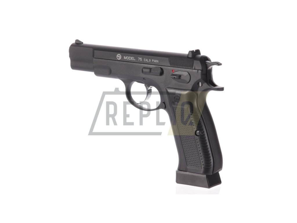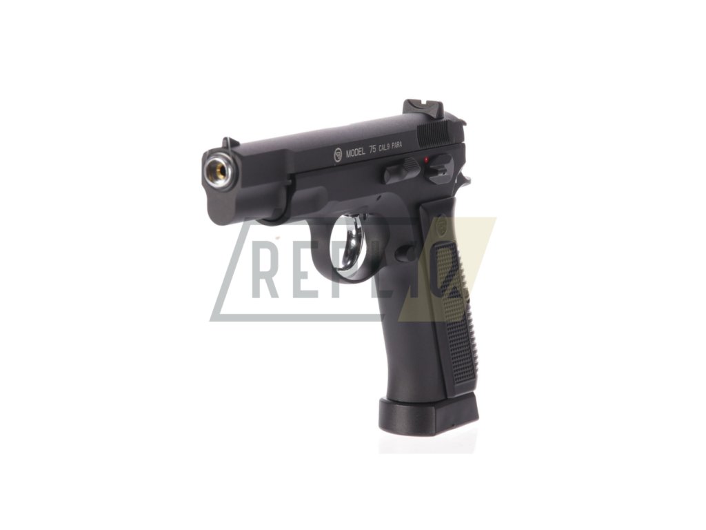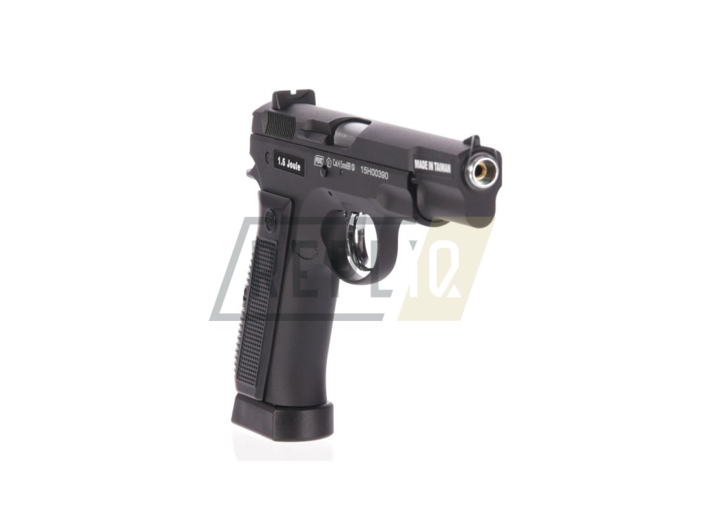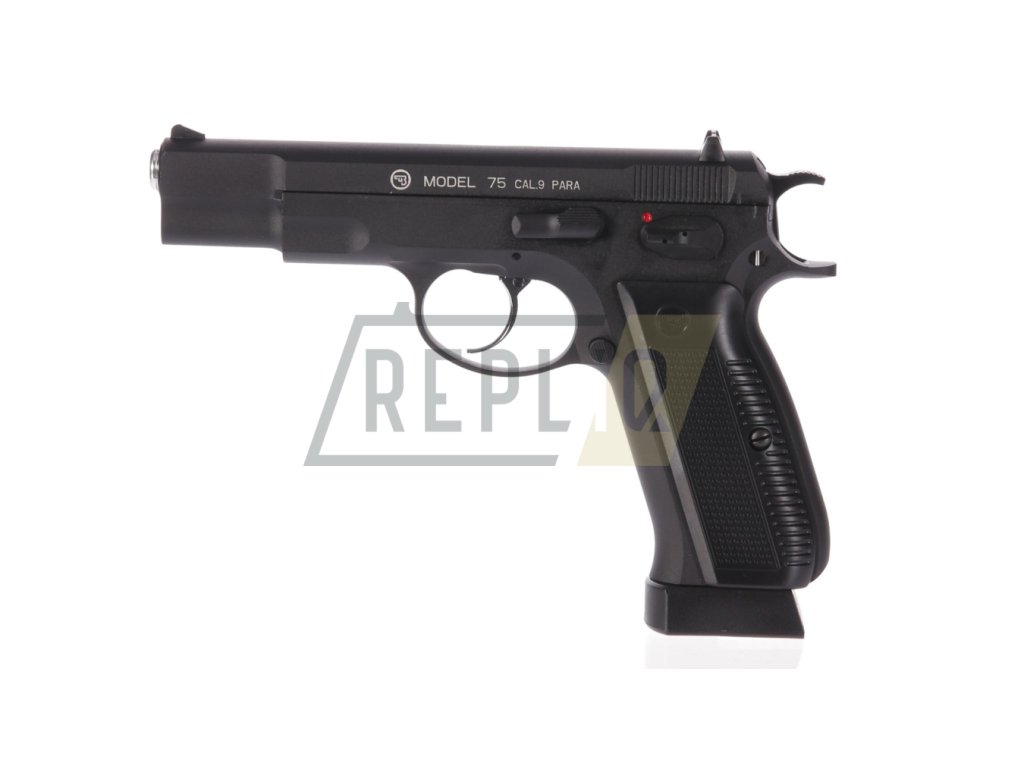 CZ-75 s celokovovým provedením v matně černém designu. Střenky jsou zdobené logem Česká Zbrojovka. Jako originál má tato vzduchovka pojistku proti náhodnému výstřelu, kdy v horní pozici je zbraň zajištěna a v dolní pozici odjištěna.