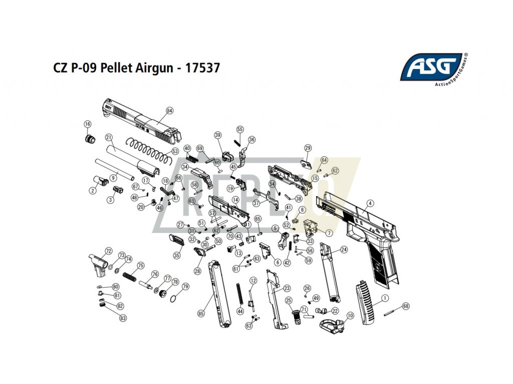Vzduchovka CZ-75 P-09 disponuje oboustranným zásobníkem s věnečky o kapacitě 16-ti diabolek, integrované magnety umožňují, aby do věnečků mohly být vloženy i ocelové broky. Manuální pojistka je stejná jako u ostré předlohy. Zbraň je poháněna 12-ti gramovou bombičkou, která dokáže vystřelit až 70 diabolek. Po vyprázdnění jednoho věnečku stačí zásobník pouze obrátit. První výstřel se dá uskutečnit natažením kohoutku, natažením závěru (režim SA) nebo jen stačí zmáčknout spoušť (režim DA). Po prvním natažení pracuje pistole v samonabíjecím režimu.
