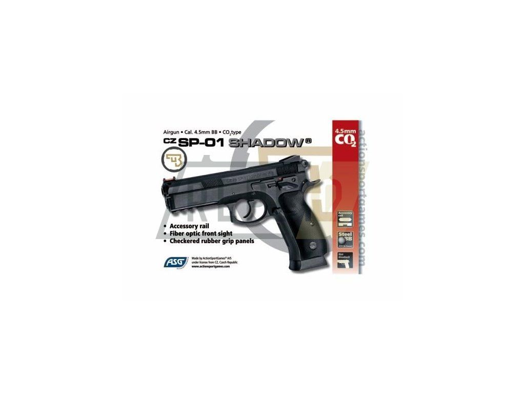 Vzduchová pistole ASG CZ-75 SP-01 je na ocelové broky BB. Vzhled i váha pistole jsou velice autentické díky polymerové konstrukci s kovovými vnitřními díly. V zásobníku na 21 broků se nachází komora na CO2 bombičku, kterou je nutné po vložení dotáhnout klíčem. Klíč na dotažení je součástí balení. Zásobník se uvolňuje stisknutím pojistky, kterou najdeme na levé straně pistole. Spoušť i lučík jsou vyrobeny z polymeru.