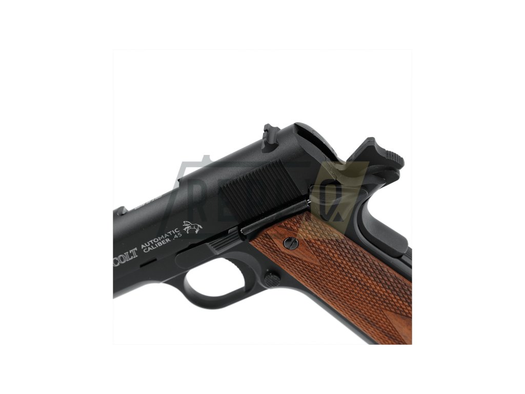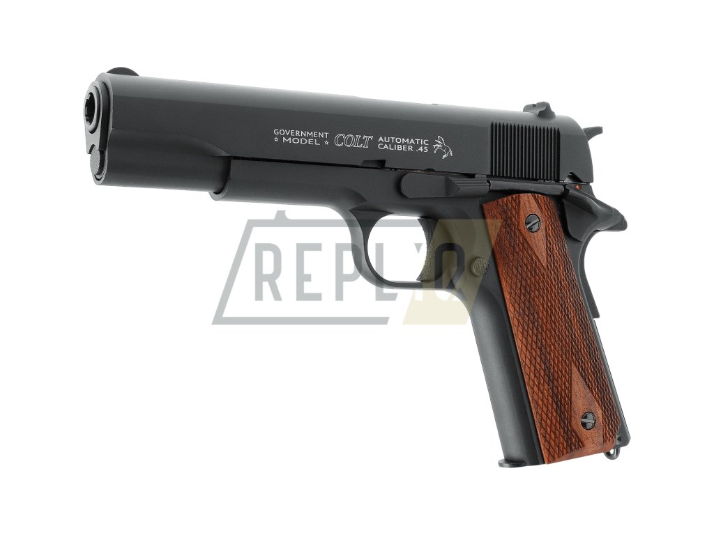 Autentická replika léty prověřené armádní a také gengsterské pistole Colt Government 1911 ve vzduchovkovém provedení na ocelové BB broky 4,5mm.Celokovovou konstrukci zbraně doplňují plastové střenky ve velmi zdařilé imitaci ořechového dřeva s diamantovou rytinou pro stabilní úchop.
