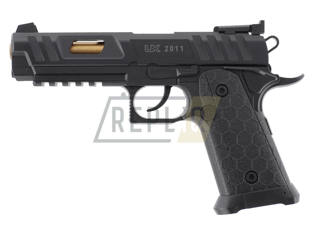 zduchová pistole Umarex 2011Pistole UX 2011 je modernizovanou verzí Coltu 1911 s otevřeným závěrem, aby byla vidět hlaveň.