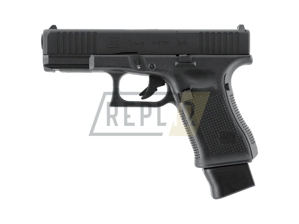 Věrná replika Glocka 19 Gen5 v podání německého Umarexu zaujme na první pohled velice detailním zpracováním. Na výběr je hned ve čtyřech barevným provedeních - černém, coyote, tungsten gray nebo battlefield green. Celkovou realističnost dodatečně zvyšují originální loga Glock na rukojeti a vyražené označení na závěru.