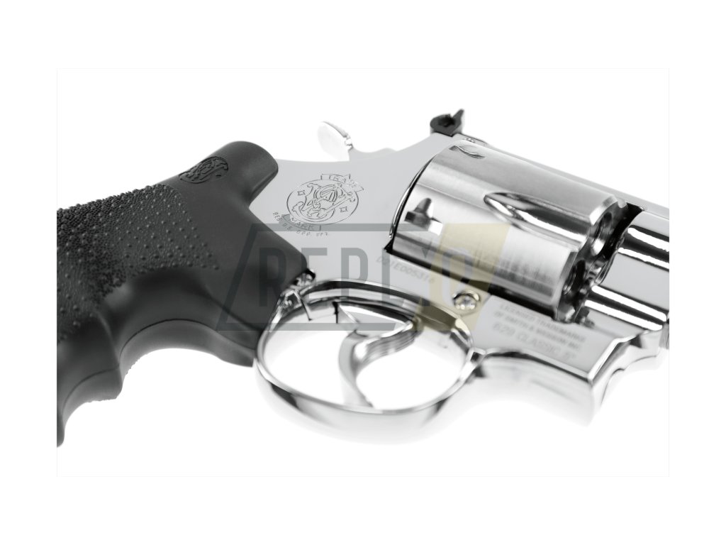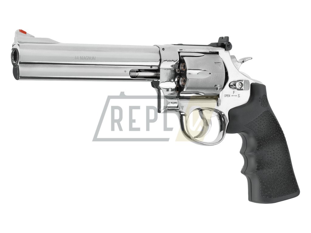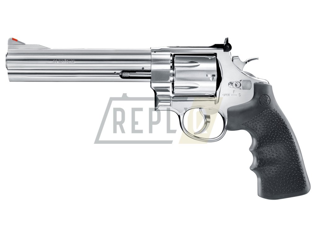 Vzduchový revolver v licenci americké značky Smith & Wesson. Díky licenci může nosit originální loga.Masivní konstrukce. Téměr celý vyroben z kovu jen střenka je černá plastová.Revolver ke střelbě využívá pohon CO2 plynem dodávaným z bombičky CO2 12g. Ta se vkládá do rukojeti pod výklopnou střenku. Bombička a utahovací šroub je skryt a neruší tak realistické provedení zbraně. Jedna bombička CO2 12 g vystačí na cca 120 výstřelů, podle teploty prostředí.