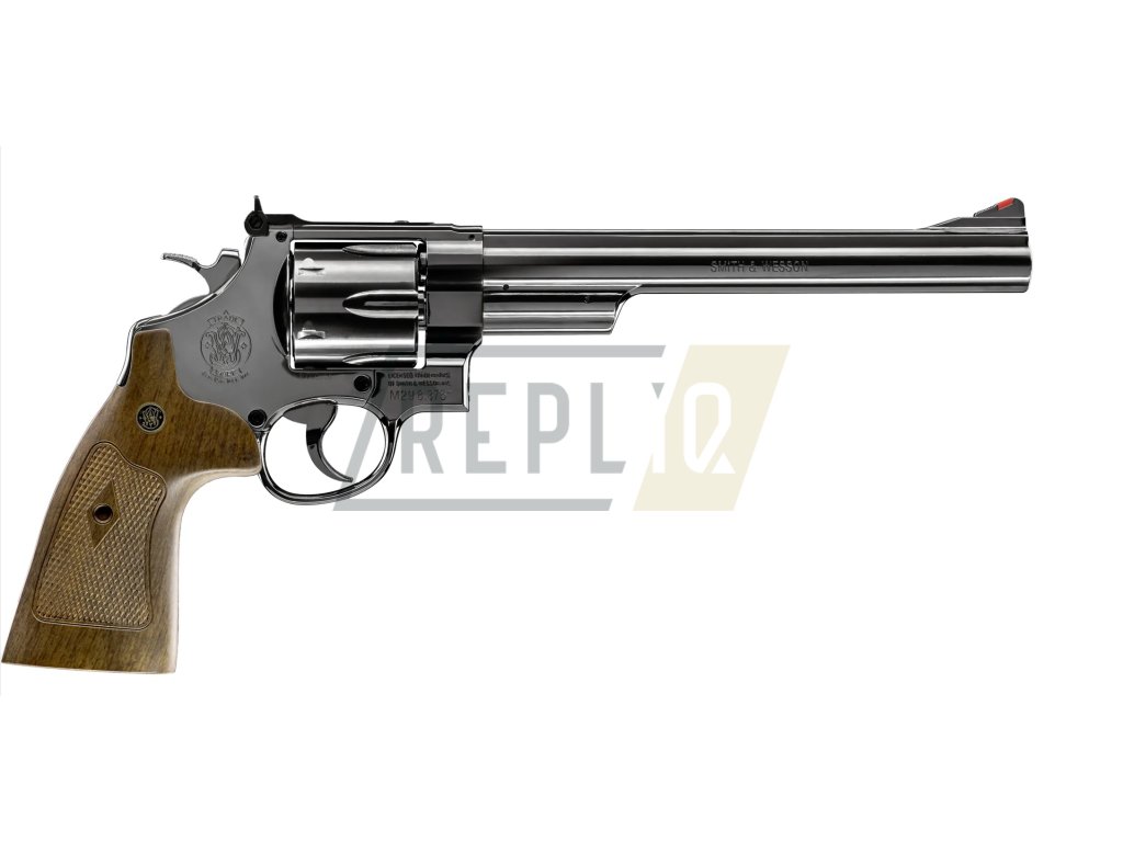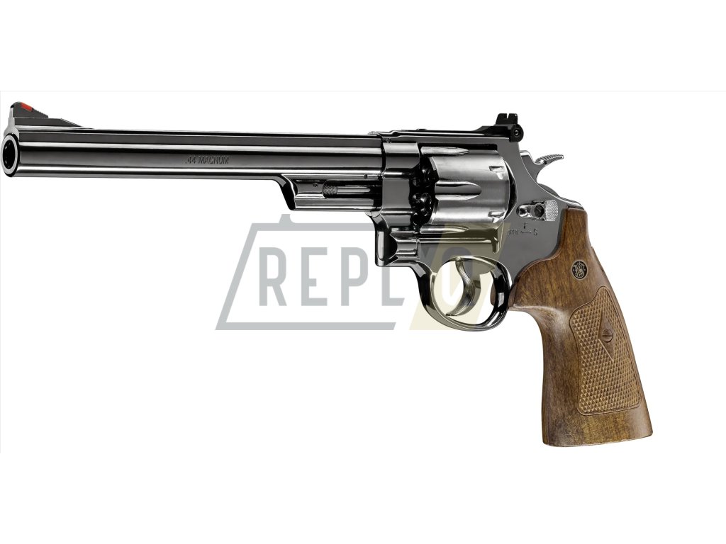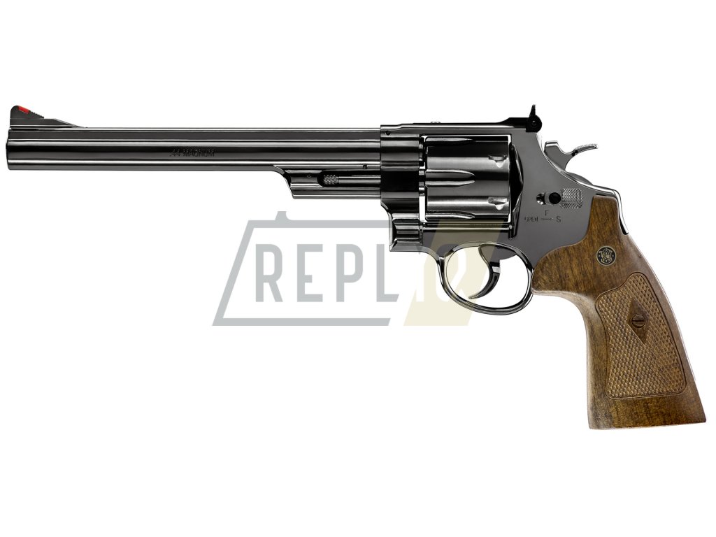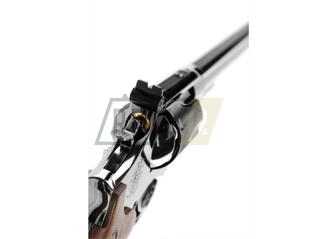 Vzduchový revolver v licenci americké značky Smith & Wesson. Díky licenci může nosit originální loga. Etrémně masivní konstrukce. Téměr celý vyroben z kovu jen střenka je plastová v hezkém dekoru dřeva.Revolver ke střelbě využívá pohon CO2 plynem dodávaným z bombičky CO2 12g. Ta se vkládá do rukojeti pod výklopnout střenku. Bombička a utahovací šroub je skryt a neruším tak realistické provedení zbraně. Jedna bombička CO2 12 g vystačí na cca 120 výstřelů, podle teploty prostředí.