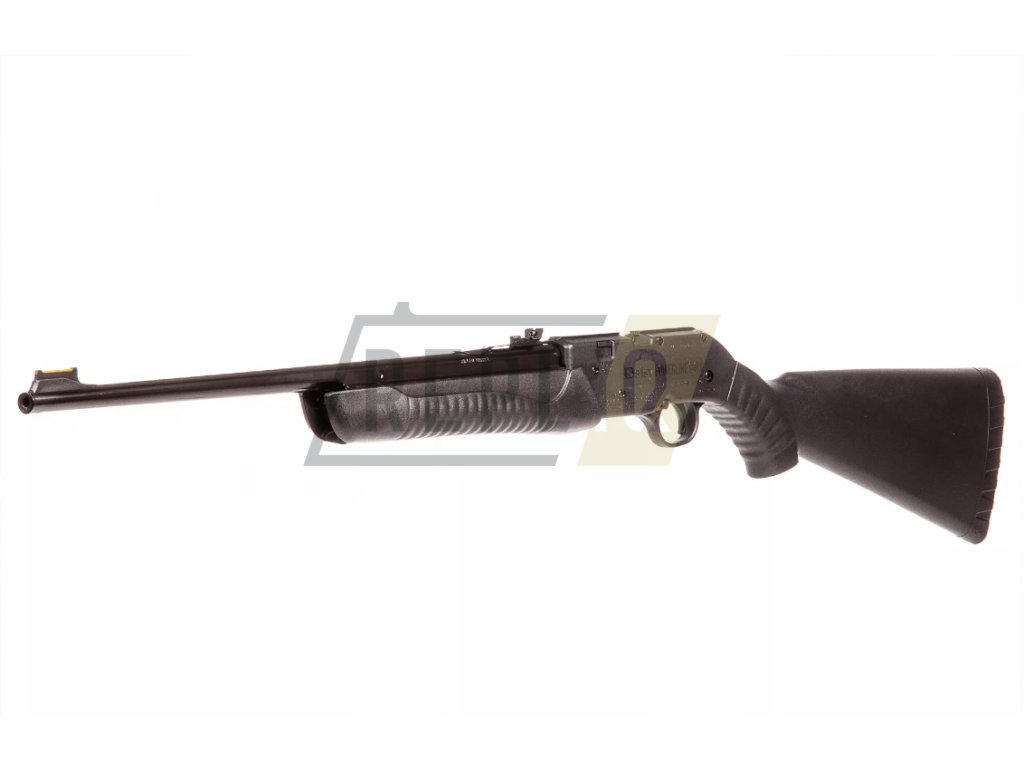 Polymer je na pažbě i předpažbí vroubkovaný tak, aby se puška dobře držela. Tato puška má značnou výhodu v tom, že využívá dva druhy střeliva, a to ocelové broky a diabolky ráže 4,5 mm. Na levé straně najdete víčko zásobníku, který pojme až 50 ocelových broků. Pokud hodláte střílet diabolkami, musíte je do nábojové komory ládovat po jedné.