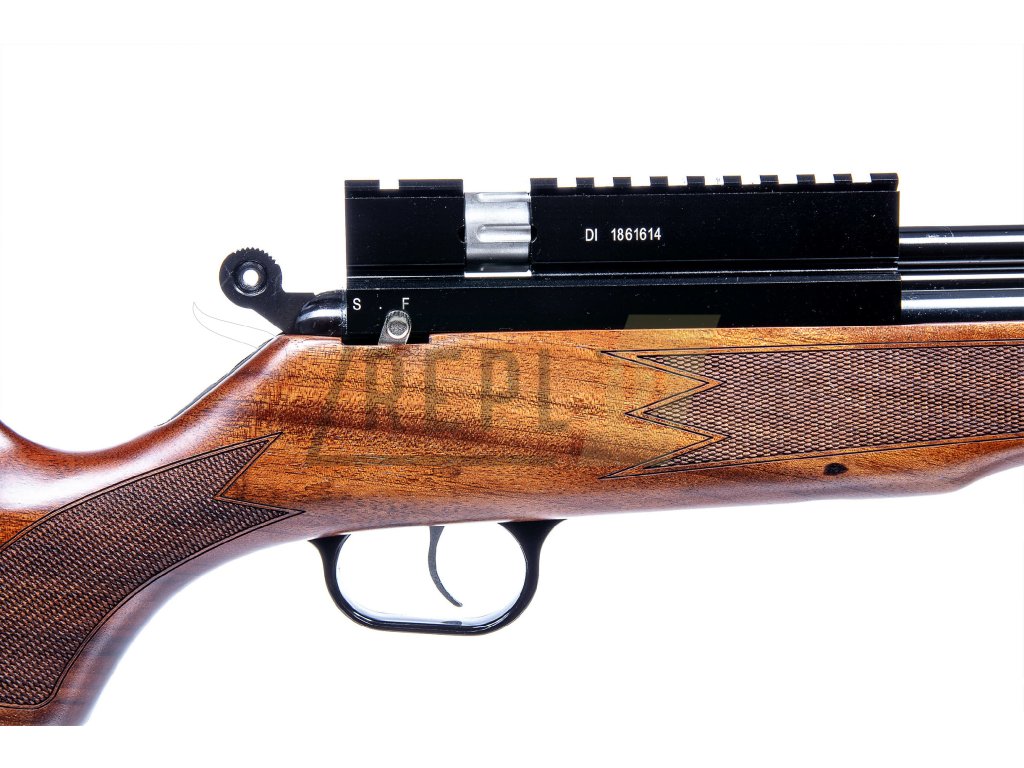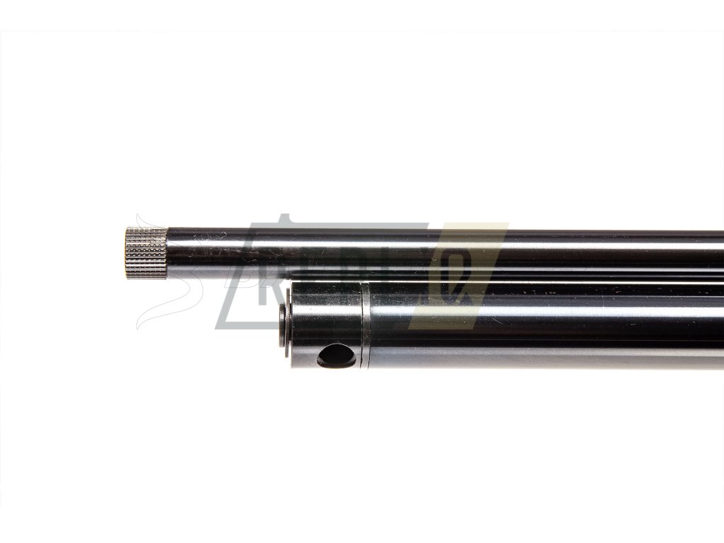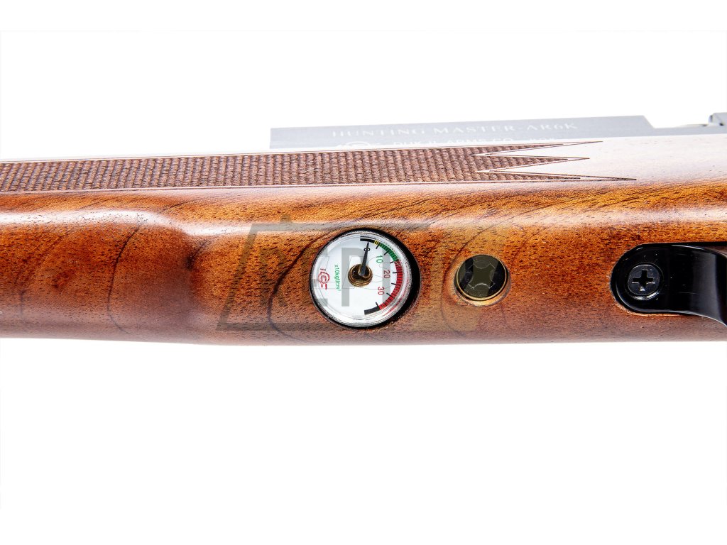 Hunting Master není vybaven klasickými mířidly, ale má místo nich má 22 mm Weaver lištu pro montáž puškohledu. Samozřejmě nechybí ani manometr pro kontrolu aktuálního tlaku vzduchu v kartuši. Při plném natlakování by vám kartuše měla poskytnout 80 až 110 plnohodnotných výstřelů