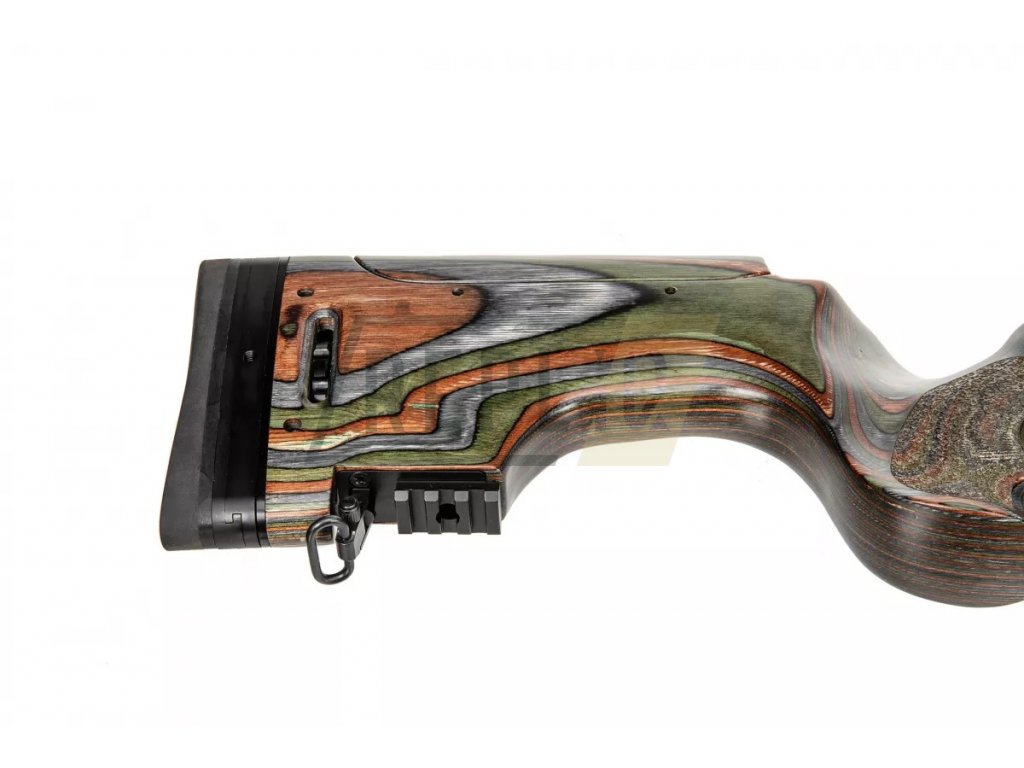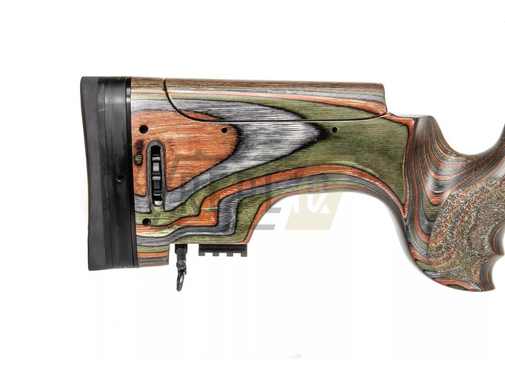 Odolná laminátová pažba se pyšní výborným zpracováním, ergonomickým tvarem a zdrsněným povrchem rukojeti pro kvalitní úchop. V rámci maximálního komfortu je pak zakončena nastavitelnou gumovou botkou a variabilní lícnicí.