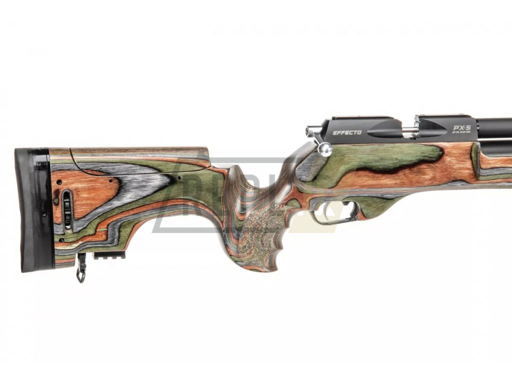 Pažba je zakončena nastavitelnou gumovou botkou a stejně tak je variabilní i lícnice. Na konstrukci naleznete klasickou rybinu 11 mm na montáž optiky; na předpažbí a na pažbě se nachází dopľnkové 22 mm lišty. Puška disponuje čtyřdobým závěrem, který slouží i jako sekundární pojistka.PX-5 Sport je špičková PCP vzduchovka ze stejnojmenné řady firmy Effecto. Oproti jiným variantám se linie Sport vyznačuje několika upgrady.