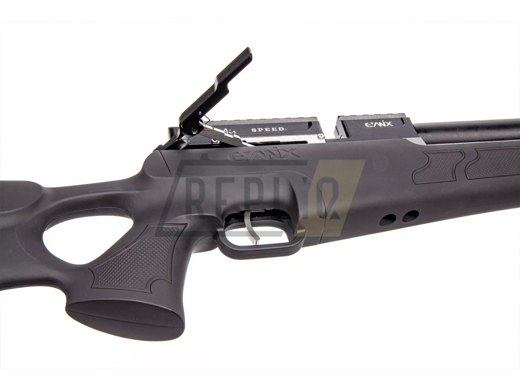 Držte si klobouky, druhá generace semi-auto vzduchovky Evanix Air Speed je tady a je ještě rychlejší a spolehlivější než dřív. Rychlost (speed) nemá v názvu jen tak pro nic za nic. Zamilujete si rychlopalbu bez nutnosti přebíjení, diabolky budou zasahovat terč jedna za druhou tak rychle, jak stihnete mačkat spoušť.Air Speed Gen.2 zaujme hned na první pohled polymerovou thumbhole pažbou. Ta má velmi příjemnou ergonomii i povrchovou úpravu a umožňuje pohodlné zalícení pravákům i levákům. Zásobu vzduchu poskytuje 280cc kartuše s maximálním pracovním tlakem 250 bar. Zbývající tlak můžete zjistit na manometru v přední části kartuše. Hned za ním je ukryt plnící otvor. Ani hlaveň nezaznamenala oproti první generaci žádnou změnu. Její délka činí 500 mm a je chráněna pláštěm, který částečně tlumí hluk výstřelu. Kdo chce být tichý jako vánek, může ještě dodatečně namontovat libovolný moderátor hluku s 1/2 UNF závitem.