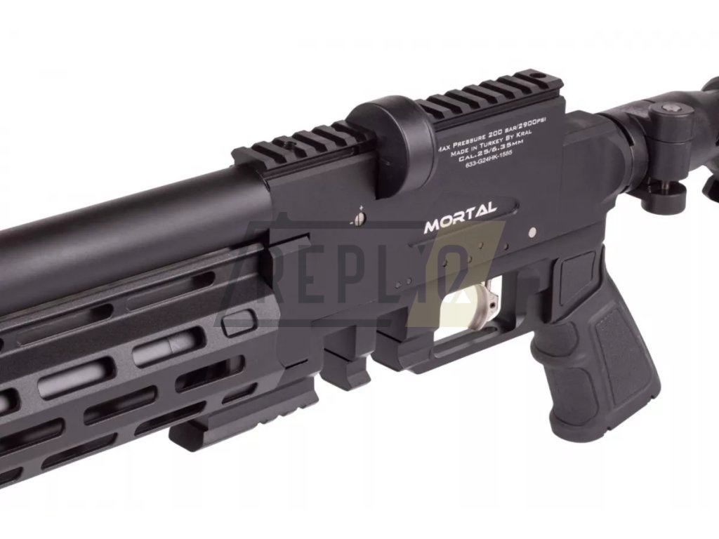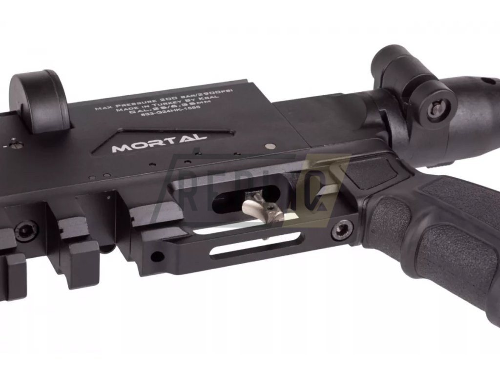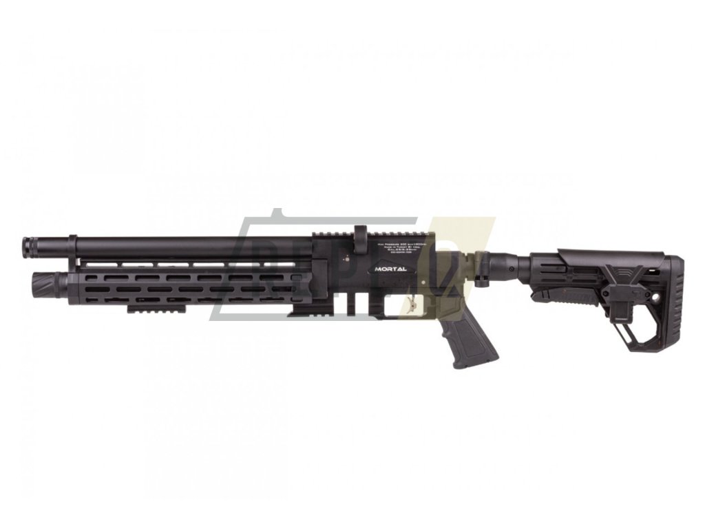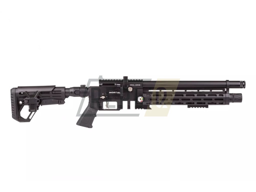 Mortal S je takticky laděná PCP vzduchovka od tureckého výrobce Kral Arms. Zbraň je osazena sklopnou pažbou typu AR-15 s výškově stavitelnou lícnicí a gumovou botkou. Pažba je také výsuvná, takže si můžete jednoduše upravit její délku.Oplášťovaná hlaveň má délku 407 mm a na ústí najdete závit 1/2 UNF pro případnou montáž externího moderátoru hluku. Nabíjecí páka je umístěna z pravé strany a před ní se nachází otočný šroub pro regulaci výkonu. Ten lze nastavit v rozmezí od 10 J do 38 J.