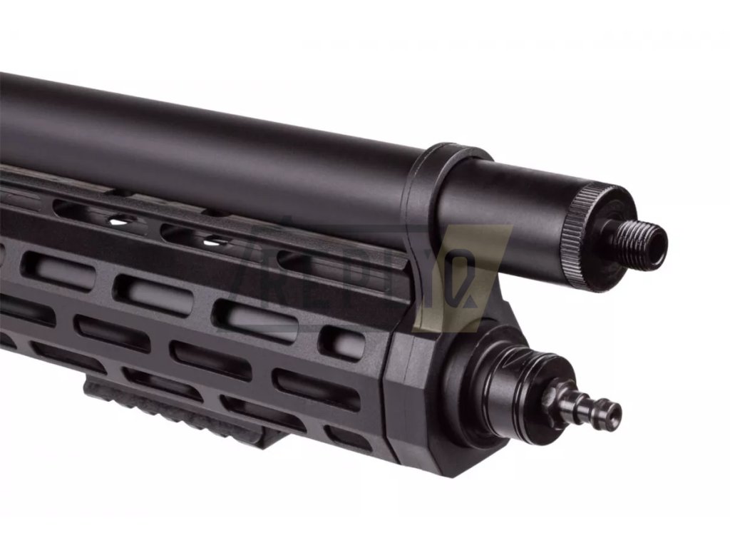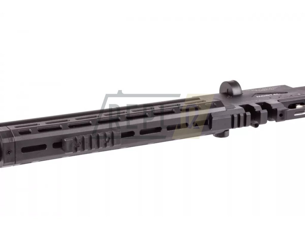 Celkový taktický vzhled ještě doplňuje M-LOK předpažbí, které je osazeno dvěma Picatinny lištami. Zadní lišta slouží k uchycení bipodu a na tu druhou si můžete přichytit taktický foregrip, který je součástí balení. Další montážní lištu stejného standardu najdete i na horní straně větrovky a ta slouží k uchycení puškohledu.