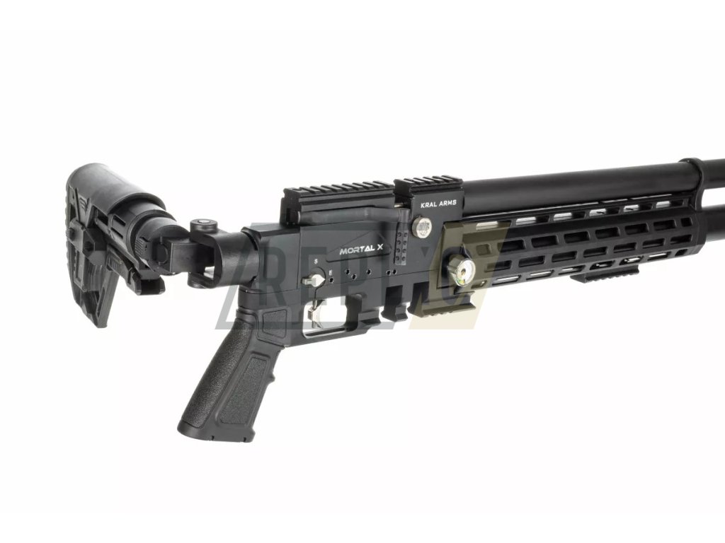 Mortal X je takticky laděná PCP vzduchovka od tureckého výrobce Kral Arms. Zbraň je osazena sklopnou pažbou typu AR-15 s výškově stavitelnou lícnicí a gumovou botkou. Pažba je také výsuvná, takže si můžete jednoduše upravit její délku.