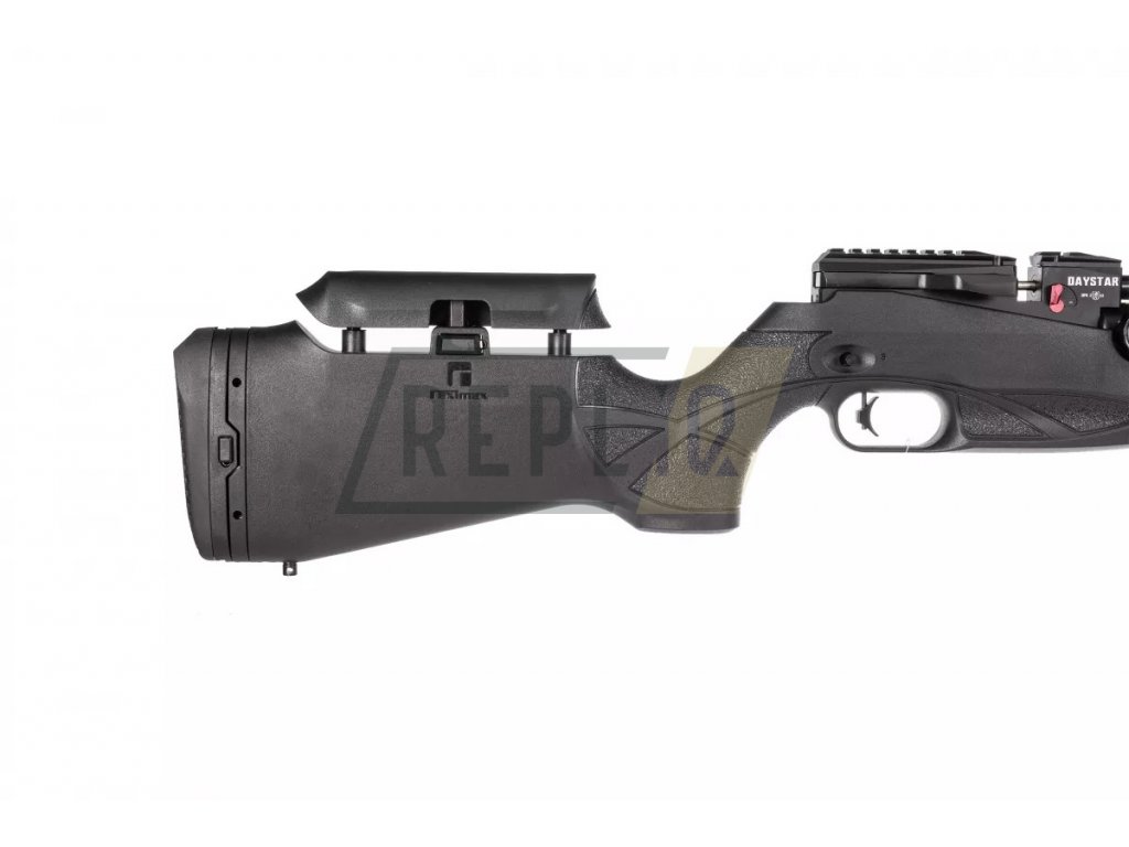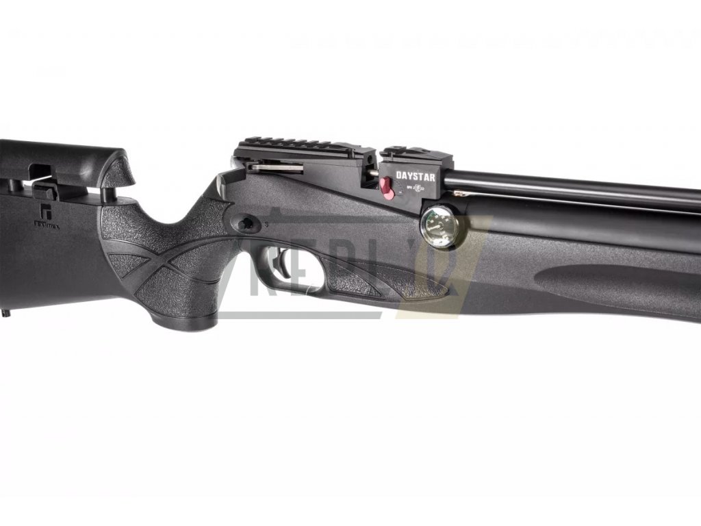 Reximex Daystar S působí ihned na první pohled solidním dojmem, a to především díky odolné syntetické pažbě. Velkou předností pažby je možnost nastavení výšky lícnice a přítomnost úchytů (na předpažbí a na konci pažby) pro bipod či popruh. V místech úchopu je pažba pokryta hrubou texturou, která poskytuje stabilní oporu pro dlaně, což je velmi praktické, pokud střílíme delší dobu. Na samém konci pažby se nachází gumová botka.K přebíjení slouží přímotažná napínací páka. Při pohybu páky vzad dojde k pootočení zásobníku a při pohybu vpřed dojde k vložení diabolky do komory. Vnitřní mechanismus je poháněn kartuší o objemu 260 ccm s pracovním tlakem 250 Bar. U ráže 4,5 mm zásobník pojme 14 diabolek.