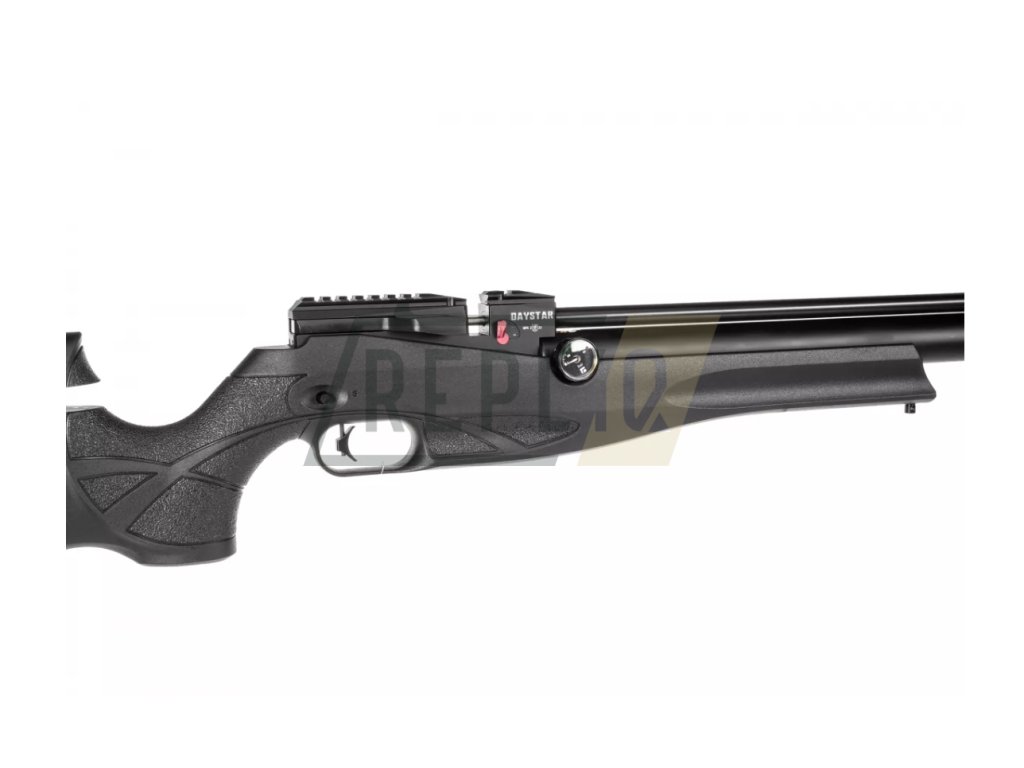 Reximex Daystar působí hned na první pohled solidním dojmem, a to především díky odolné syntetické pažbě. Velkou předností pažby je možnost nastavení výšky lícnice a přítomnost úchytů (na předpažbí a na konci pažby) pro bipod či popruh. V místech úchopu je pažba pokryta hrubou texturou, která poskytuje stabilní oporu pro dlaně, což je velmi praktické, pokud střílíme delší dobu. Na samém konci pažby se nachází gumová botka.K přebíjení slouží přímotažná napínací páka. Při pohybu páky vzad dojde k pootočení zásobníku a při pohybu vpřed dojde k vložení diabolky do komory. Vnitřní mechanismus je poháněn kartuší o objemu 260 ccm s pracovním tlakem 250 Bar. U ráže 5,5 mm zásobník pojme 12 diabolek.