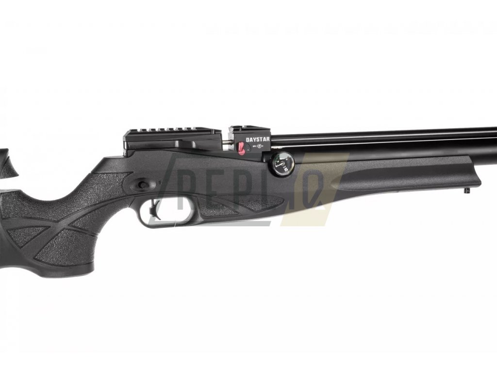 Reximex Daystar působí hned na první pohled solidním dojmem, a to především díky odolné syntetické pažbě. Velkou předností pažby je možnost nastavení výšky lícnice a přítomnost úchytů (na předpažbí a na konci pažby) pro bipod či popruh. V místech úchopu je pažba pokryta hrubou texturou, která poskytuje stabilní oporu pro dlaně, což je velmi praktické, pokud střílíme delší dobu. Na samém konci pažby se nachází gumová botka.