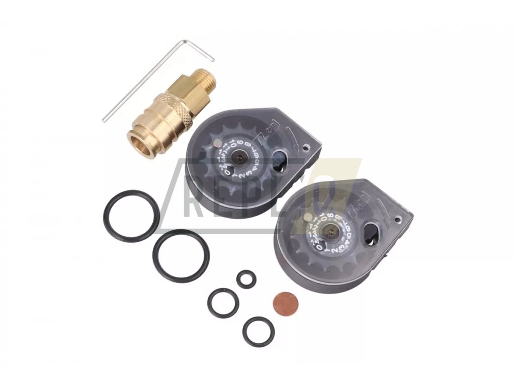 Hnací médium ve formě stlačeného vzduchu je skladováno v ocelové kartuši o objemu 500 cc a pracovním tlaku 250 bar. Zabudovaný manometr dovoluje průběžně kontrolovat aktuální úroveň naplnění. Samotné plnění se provádí pomocí přiložené v balení rychlospojky.