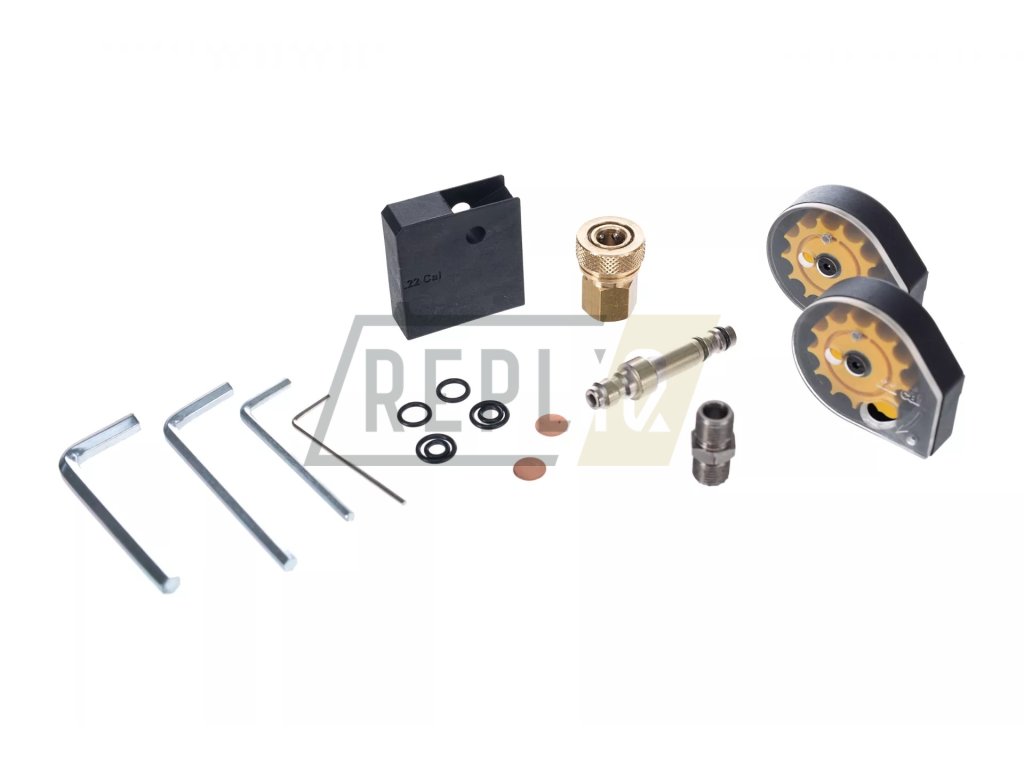 Společně se vzduchovkou dostaneme dva zásobníky, plnící adaptér quick fill a jednorannou redukci.