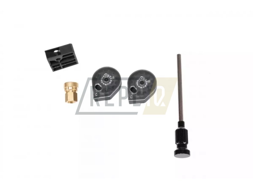 Společně se vzduchovkou dostaneme dva zásobníky, plnící adaptér quick fill a jednorannou redukci.