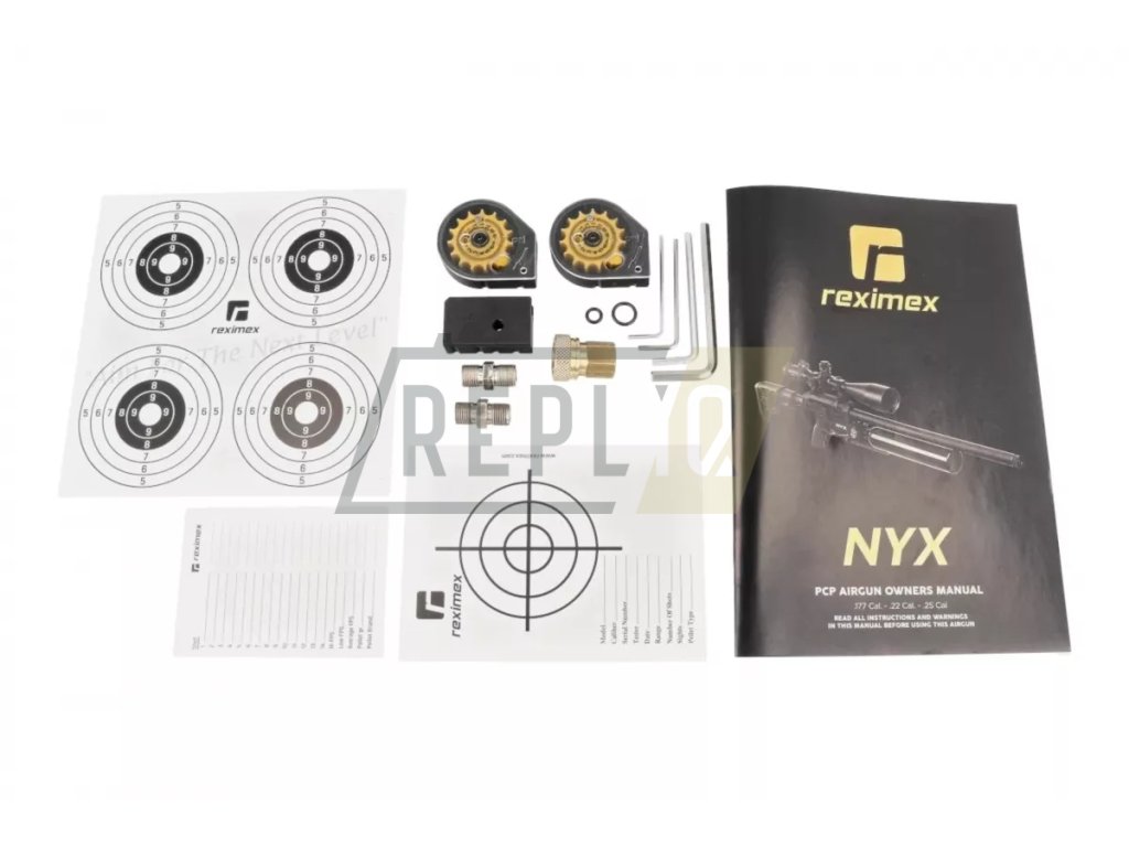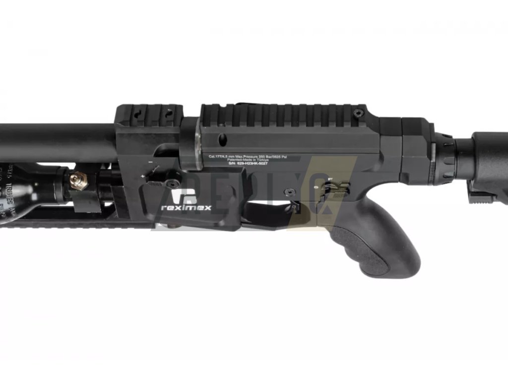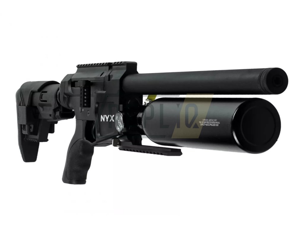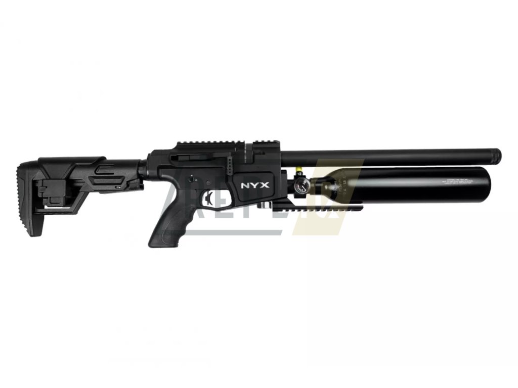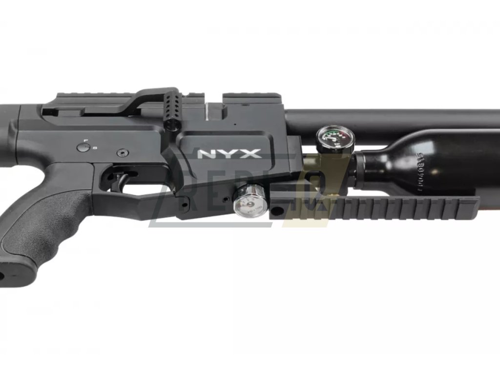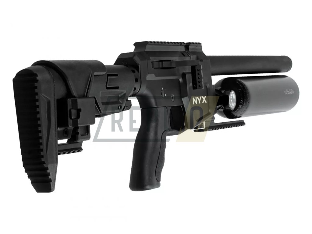 Reximex NYX je moderní vzduchovka v taktickém provedení s pistolovým úchopem, jejíž konstrukce zahrnuje teleskopickou pažbu standardu AR s gumovou botkou a nastavitelnou lícnici, takže si ji snadno přizpůsobíte podle svých preferencí. Všechny komponenty konstrukce jsou vyrobeny z kombinace eloxovaného na černo hliníku a odolného černého polymeru. Velice praktická je kompatibilnost s doplňky standardu AR, což přímo vybízí k nejrůznějším taktickým modifikacím.Dostatečný počet výstřelů na jedno nabití, a konkrétně až 75, umožňuje objemná 425cc kartuše s pracovním tlakem 250 Bar. Úroveň tlaku v jejích útrobách můžete kontrolovat pohodlně na zabudovaném manometru. Pro dosáhnutí nejlepších výsledků výrobce doporučuje jako minimální tlak úroveň 110 Bar. Nad touto hranicí si můžete být jisti ideální konzistencí díky zabudovanému regulátoru tlaku.