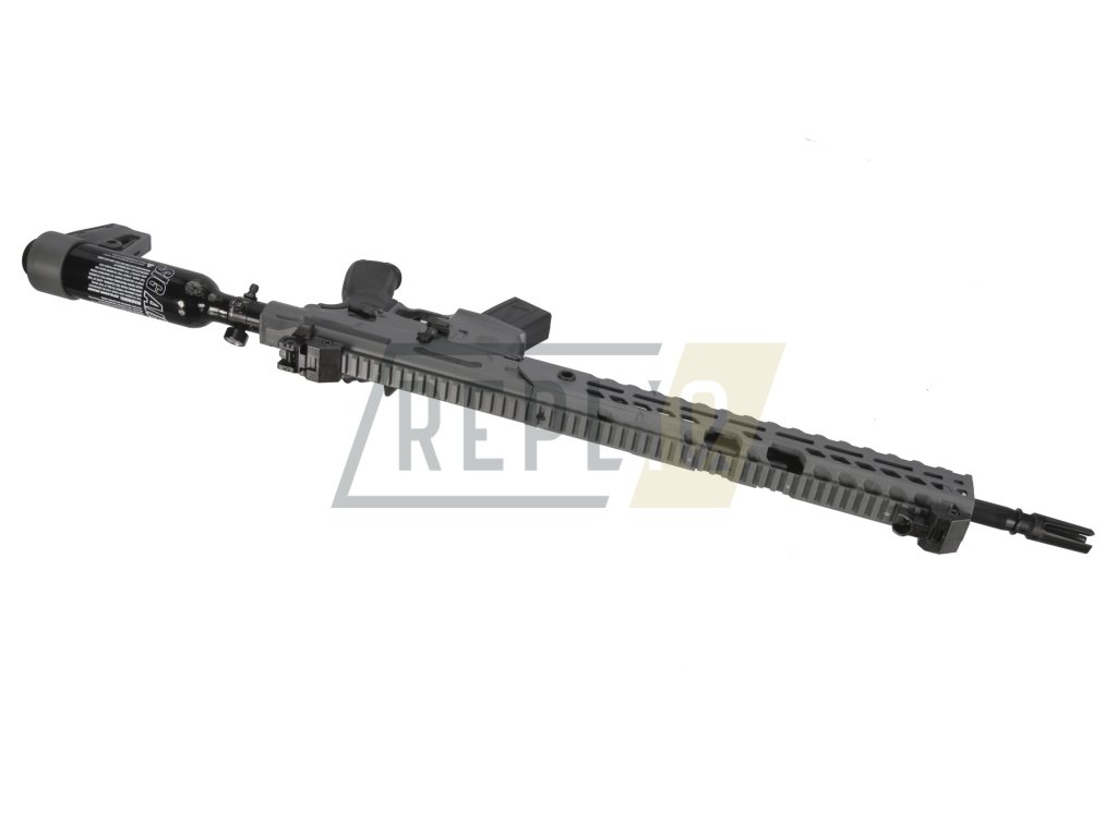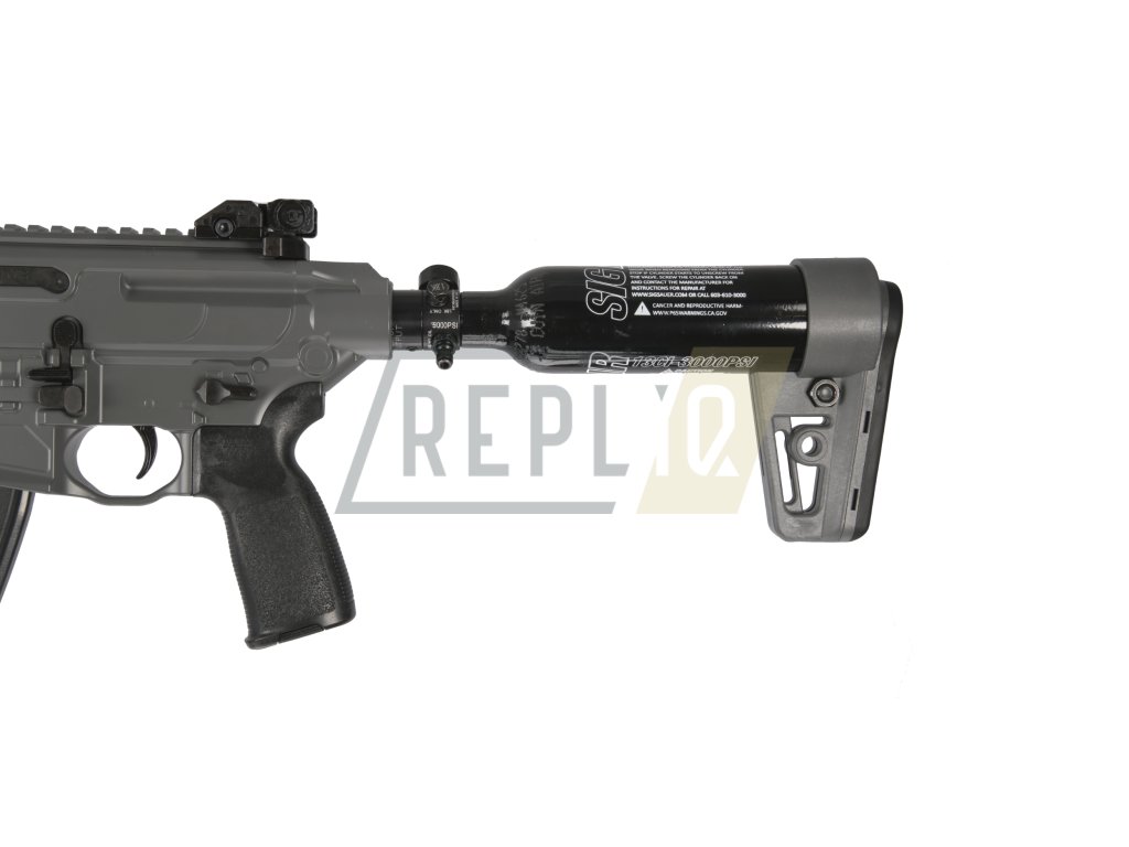 Tlaková láhev slouží nejen jako zásoba vzduchu, ale i jako pažba. Zalícení proto není zrovna komfortní. Do láhve se vměstná celkem 213 ccm vzduchu a maximální provozní tlak dosahuje 206 barů (3000 PSI). Důležité je láhev nepřeplňovat. Vzduch vystačí cca na vystřílení čtyř 30 ranných zásobníků. Celkem tedy 120 ran na jedno naplnění. Láhev se plní pomocí rychlospojky, kterou najdete níže v doporučených produktech.