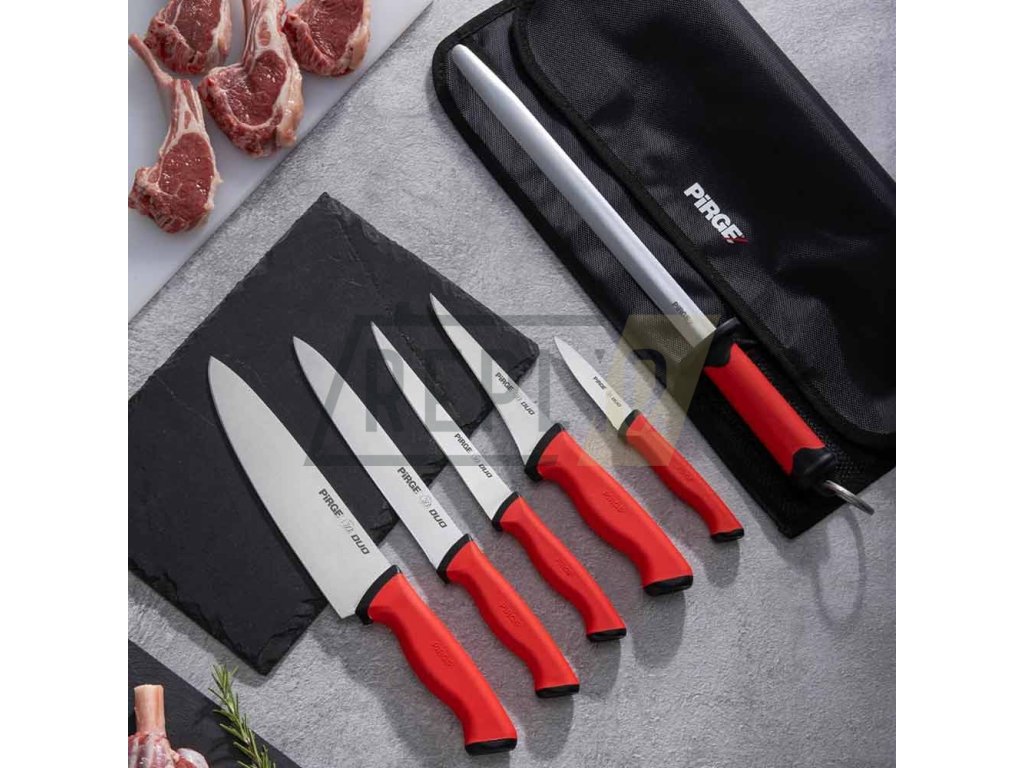 Nože ze série Pirge DUO Butcher z nerezové oceli X50CrMoV15 jsou určeny jak pro profesionální provozy, tak i k běžnému domácí použití. Tvrdost ostří dosahuje 56 HRC a je broušeno pod úhlem 20 stupňů. Tvary nožů byly navrženy profesionály s mnohaletými zkušenostmi. Krájení, plátkování, čištění masa, ovoce a zeleniny – nic nebude pro tyto nože problém. Záruka na tyto nože je 5 let a vztahuje se na jiná, než mechanická poškození a výrobní vady.