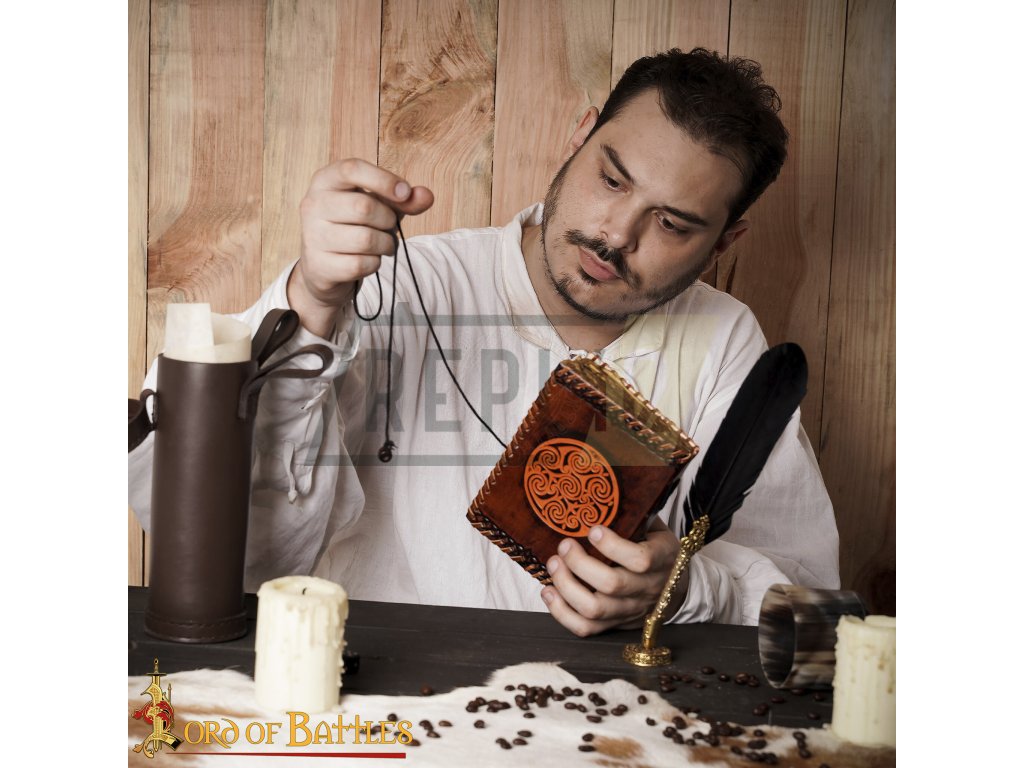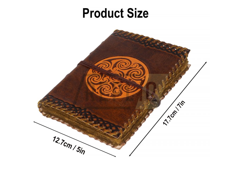 Kožený zápisník s patinovaným papírem a keltskou spirálouDeník je přibližně 13cm široký, 18cm vysoký a 3cm silný.