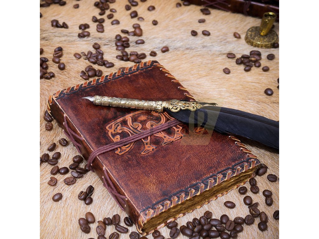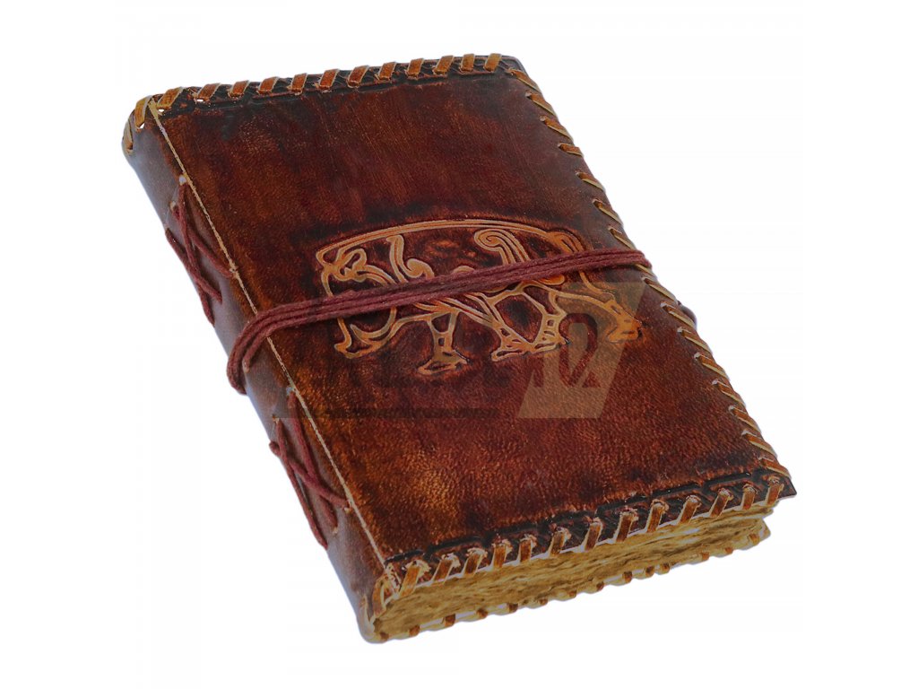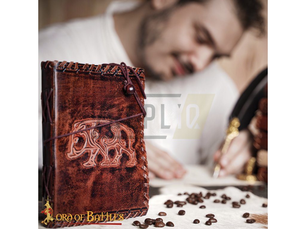 Kožený zápisník s patinovaným papírem a Keltským kancem (Mercia Kingdom)Deník je přibližně 13cm široký, 18cm vysoký a 3cm silný.