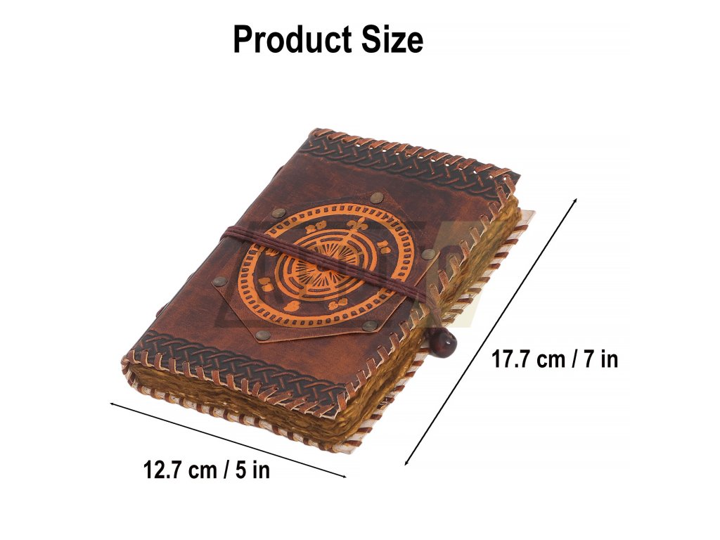 Kožený zápisník s patinovaným papírem a symbolem námořního kompasuDeník je přibližně 13cm široký, 18cm vysoký a 3cm silný.