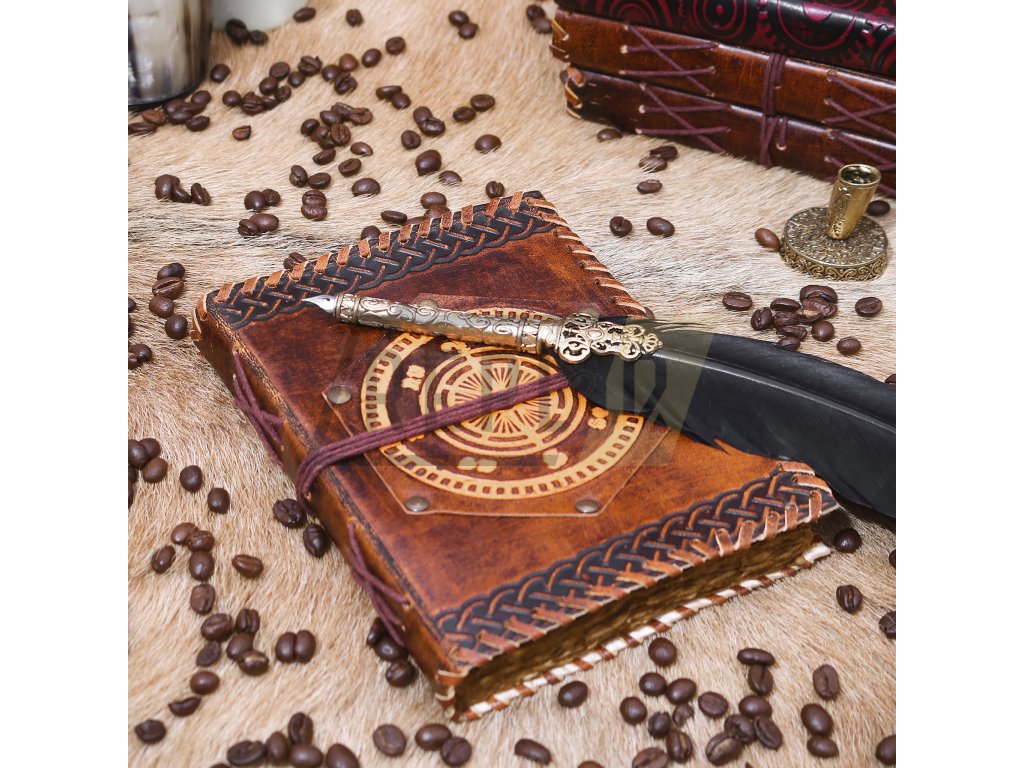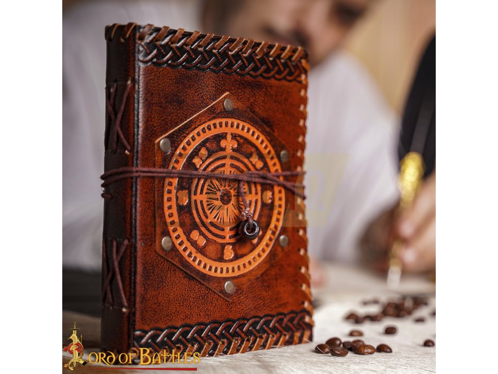 Kožený zápisník s patinovaným papírem a symbolem kompasu