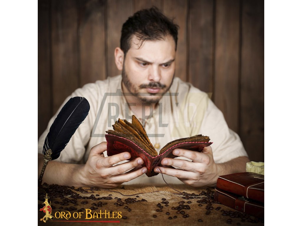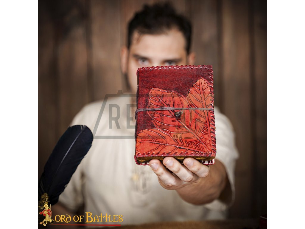Kožený zápisník s pergamenovým papírem a ražbou listu kaštanuDeník je přibližně 13cm široký, 18cm vysoký a 3cm silný.