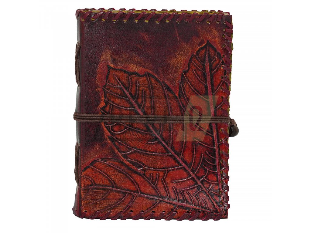 Červený kožený deník s ražbou listu a patinovaným papírem - Outlet