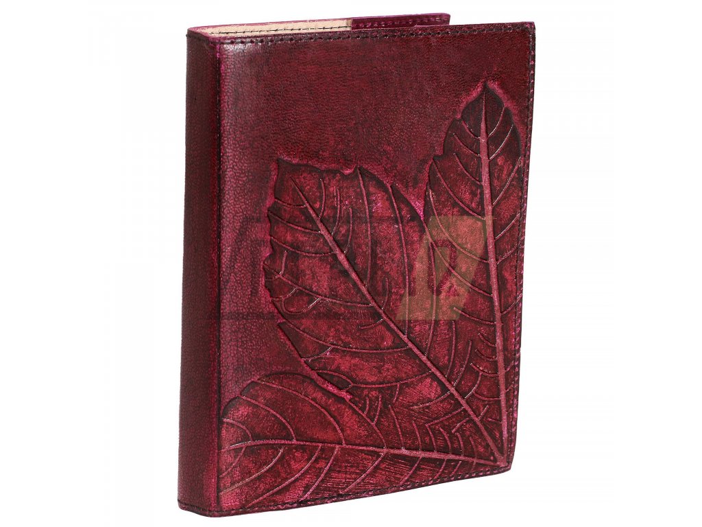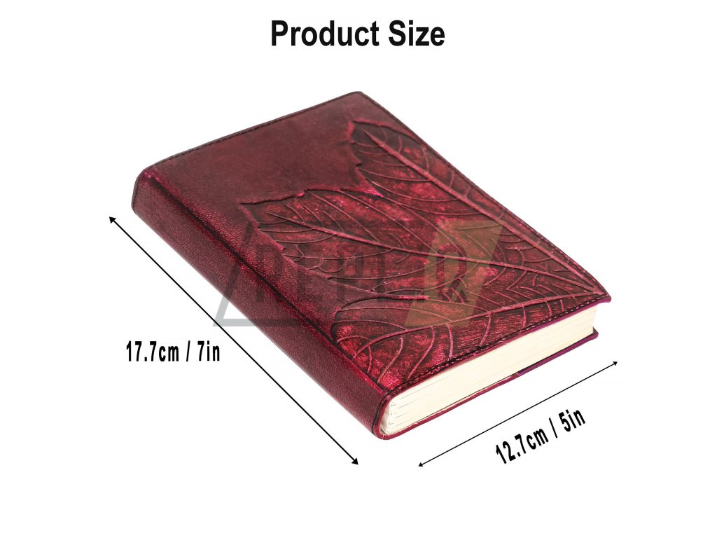 Kožený zápisník s ražbou listu KaštanuDeník je přibližně 13cm široký, 18cm vysoký a 3cm silný.