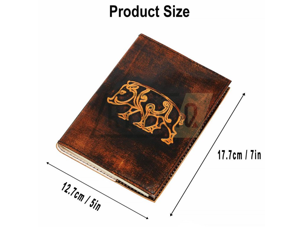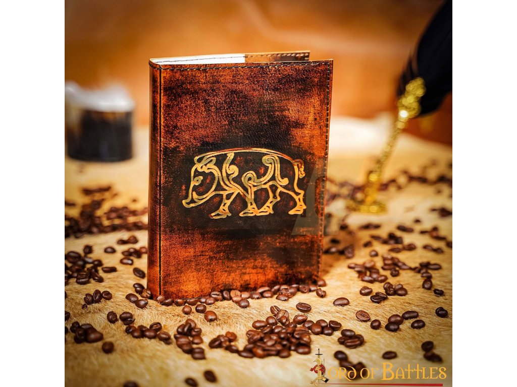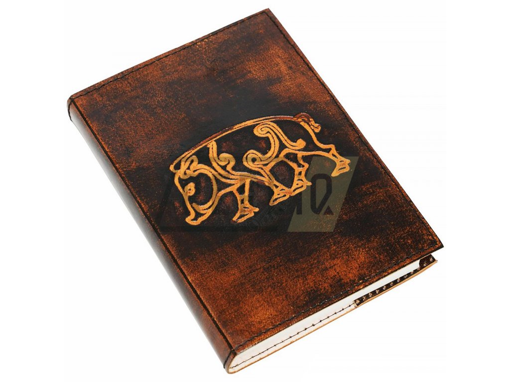 Kožený zápisník s vyraženým keltským kancemTento zápisník s keltským kancem je ručně vyrobený z eticky získané buvolí kůže. Je kvalitně zpracovaný, nabízí mechanickou odolnost a dlouhou životnost. Uvnitř se skrývá kvalitní, pevně vázaný ručně vyráběným papír, celkem 110 stran.