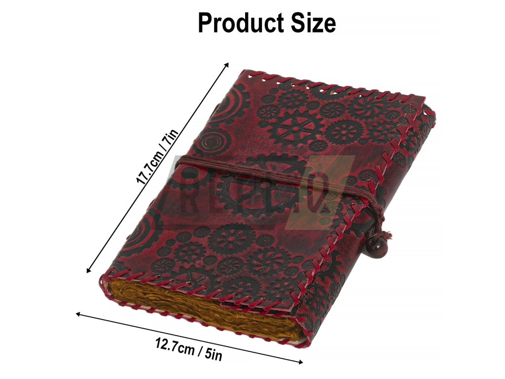Kožený zápisník Steampunk s patinovaným papíremDeník je přibližně 13cm široký, 18cm vysoký a 3cm silný.